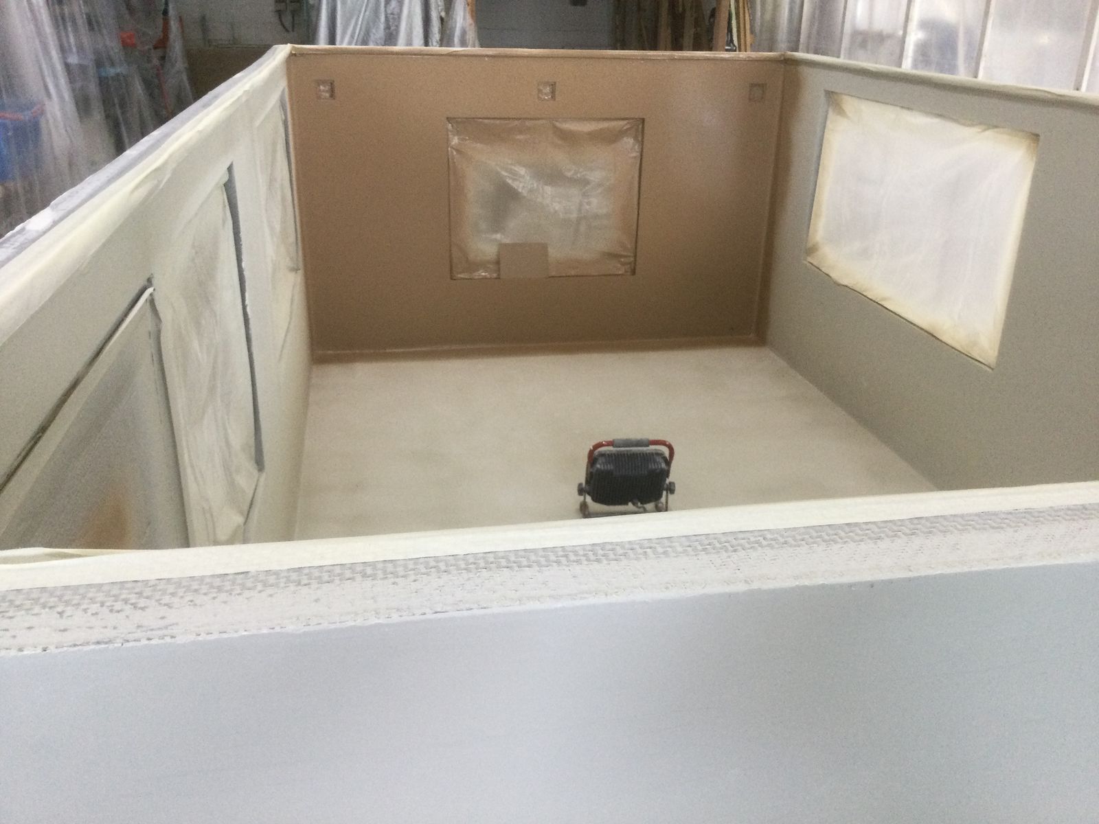 Mindestens 3 Monate nach meinem Zeitplan, nach langer Krankheit und einem schönen Familienurlaub ging es endlich weiter. Ich habe die richtige Farbe bekommen und Ober- und Unterteil fertig lackiert. Heute habe ich Freunde und Nachbarn eingeladen. Wir haben das Unterteil auf einen Trailer gesetzt, den Deckel aus der Halle geholt und den zusammen gefahrenen Aufbau ins Carport gestellt. Auch wenn es optisch passt, es soll kein Wohnwagen werden.