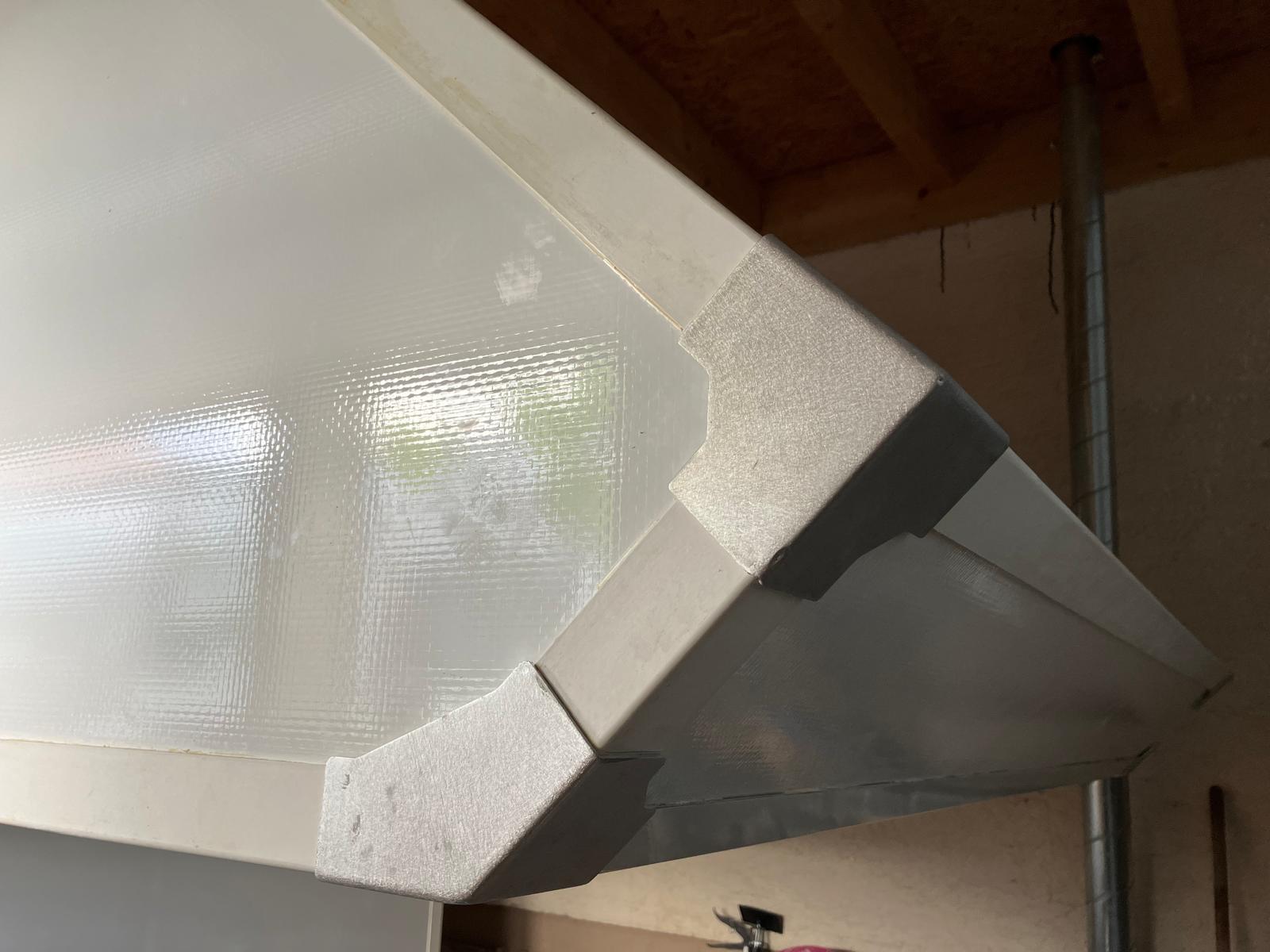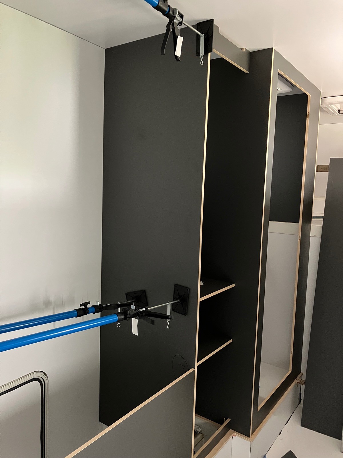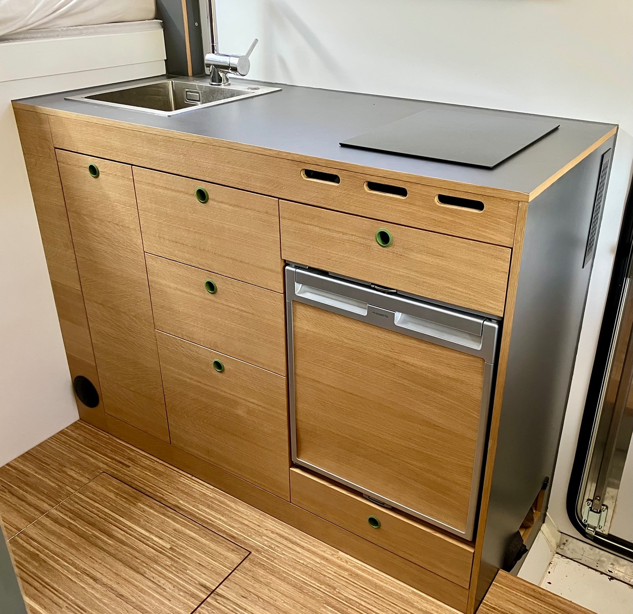 Leider löste sich der Kantenumleimer am Spülbecken, wodurch Wasser an die Schnittkante gelangen konnte. Daher baute ich die Unterbauvariante wieder aus und ein neues Spülbecken ein. Daneben fanden die Schalter für Licht, Wasserpumpe, Lüfter, Wechselrichter etc. ihren Platz und auch das Bedienteil der Standheizung. Somit lässt sich alles auch aus dem Bett bedienen.