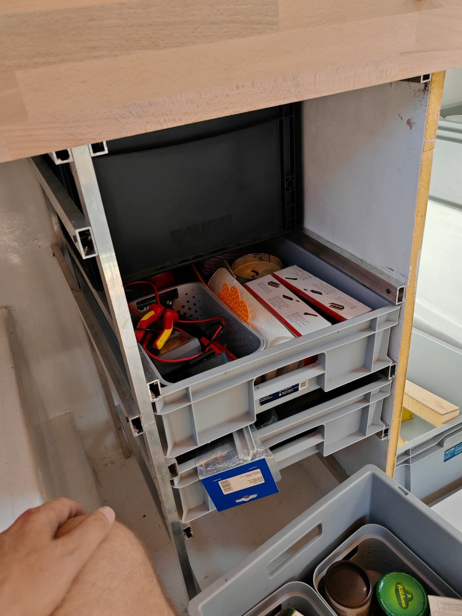 Also hab ich jetzt endlich die ersten Regale eingebaut. Vermutlich tausche ich mittelfristig noch den mittleren Steg aus Sandwich gegen eine weiter Alustange. Ich traue dem noch nicht so ganz.