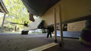 Derzeit ist alles nur auf Stoß verklebt und hält mich locker aus, Unterteil anheben an einer Ecke funktioniert auch hervorragend. Mit dem Kleben der Ecken mit Epoxidharz und Glasfaser mache ich mir um die Stabilität des Unterteils keine Gedanken mehr.
