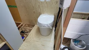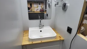 Der Waschtisch hat auch seinen Platz gefunden und der Abfluss ist mit dem Zwischentank verbunden: