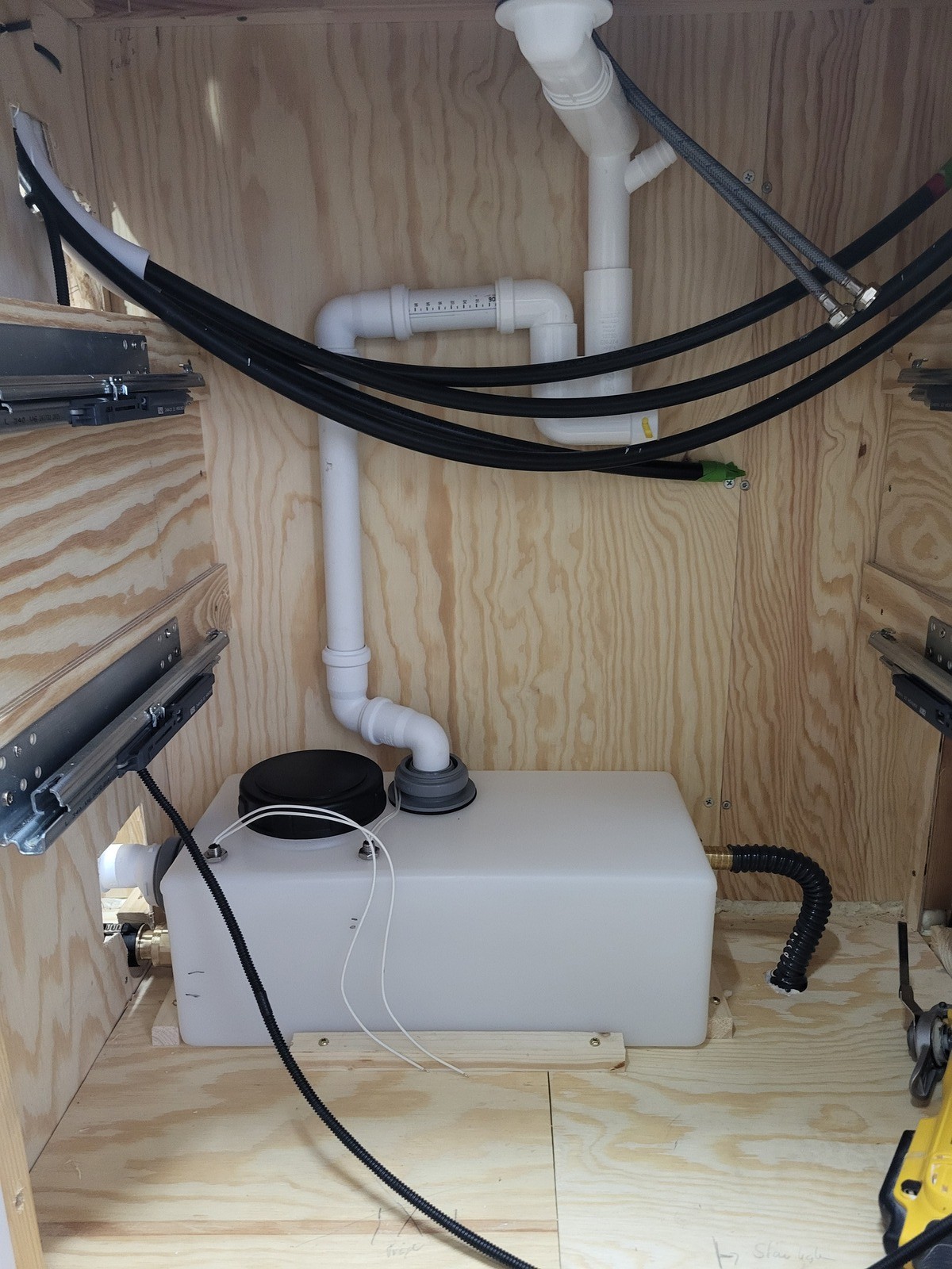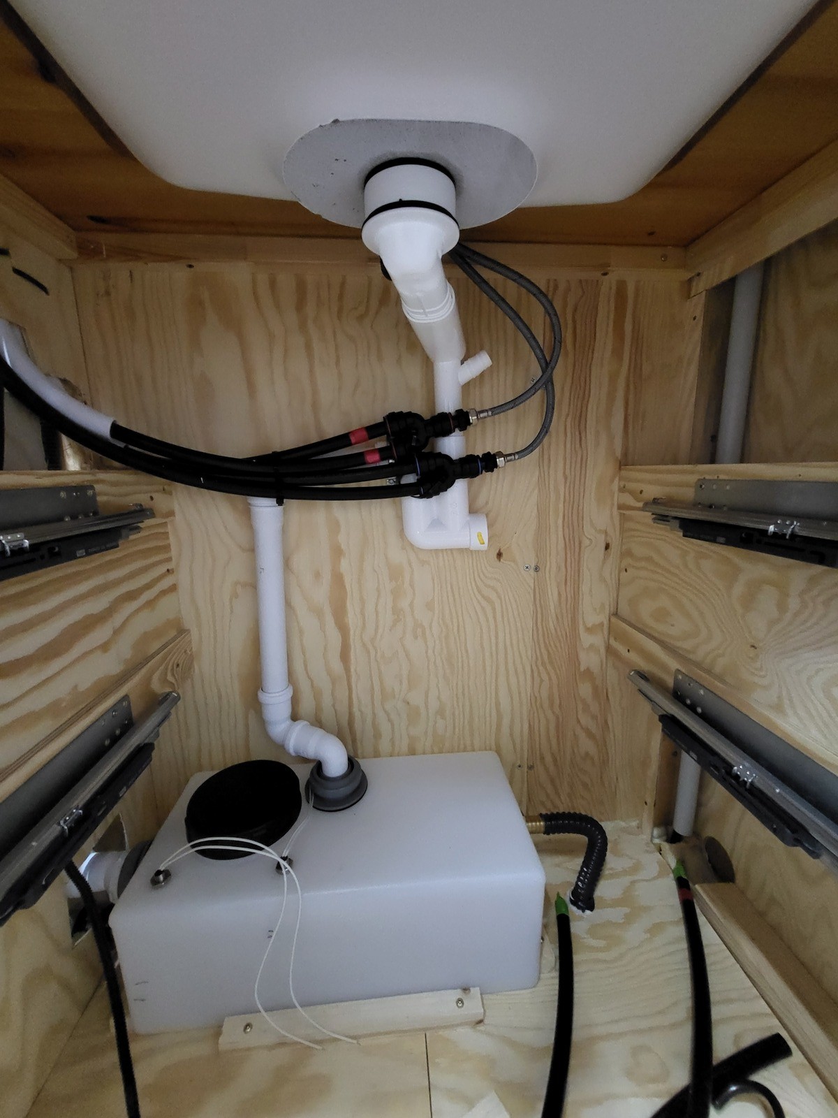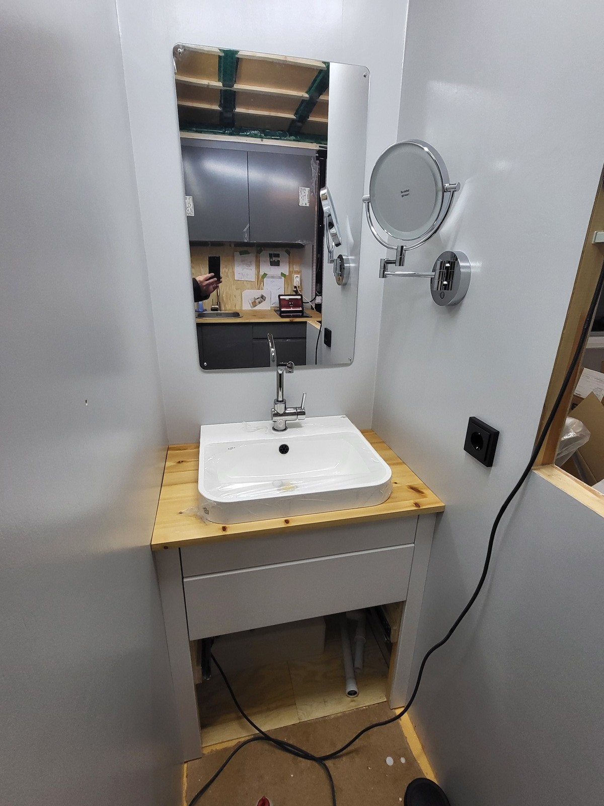 Der Waschtisch hat auch seinen Platz gefunden und der Abfluss ist mit dem Zwischentank verbunden: