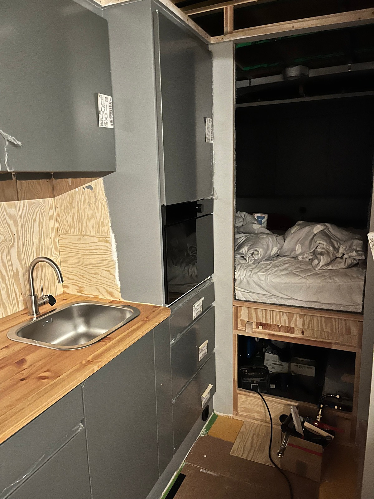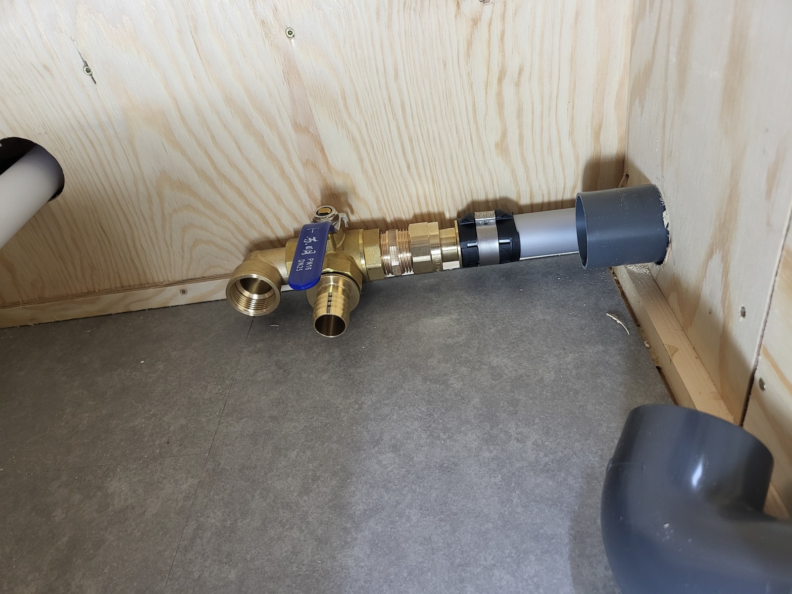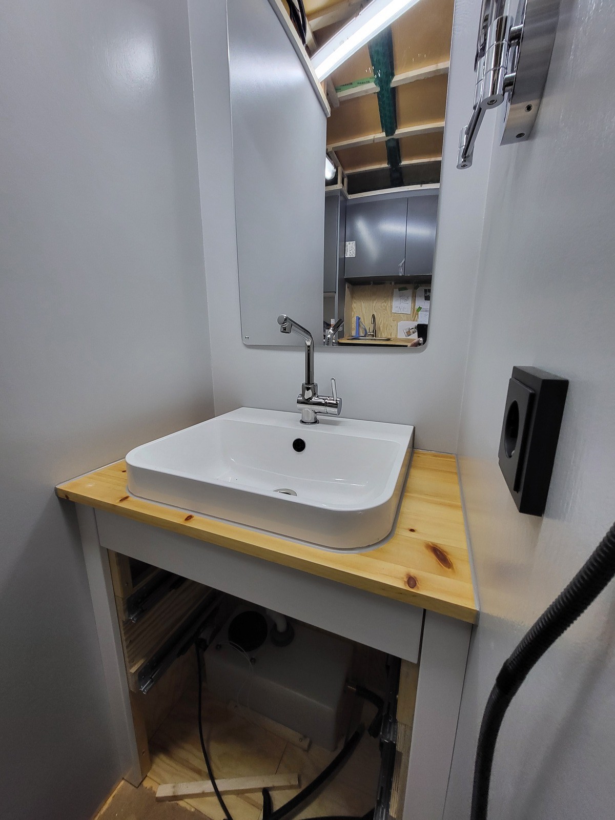 Der Waschtisch hat auch seinen Platz gefunden und der Abfluss ist mit dem Zwischentank verbunden: