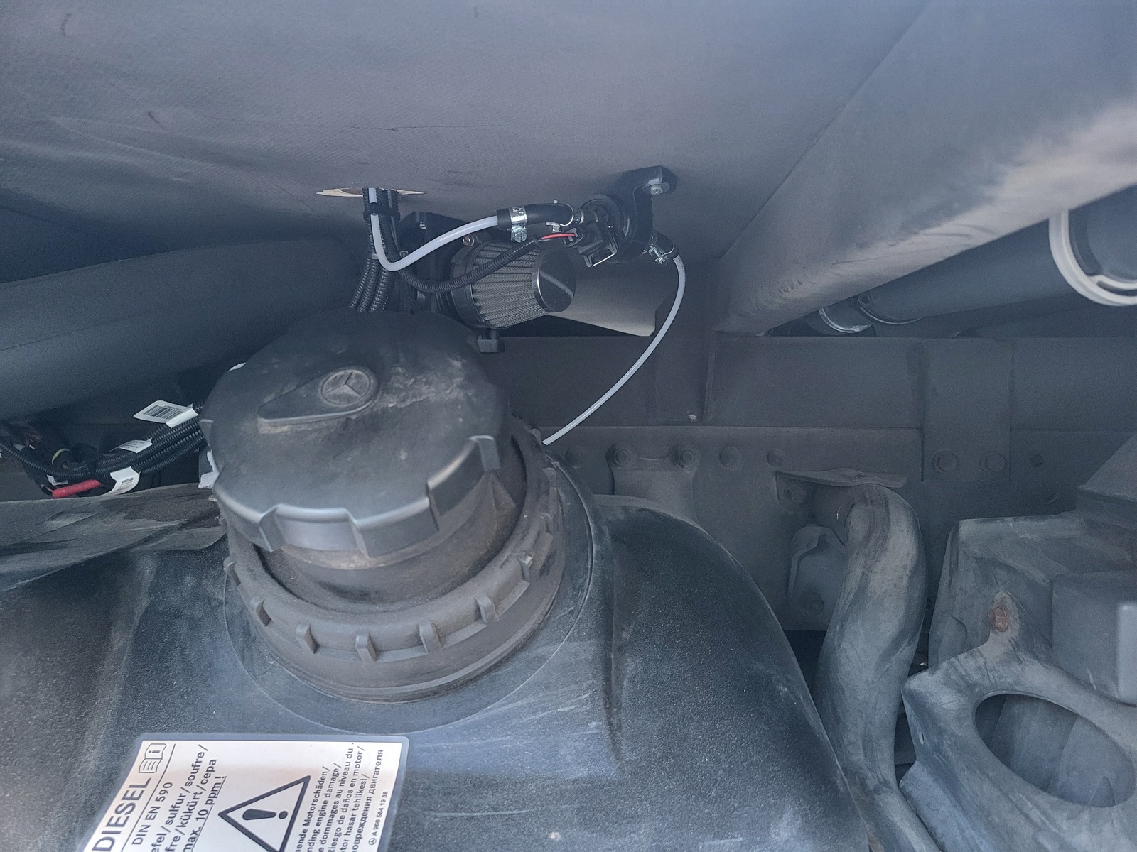 Blick in den Tank (links die Stange vom Geber daneben das Ansaugrohr, über das die Membranpumpe später auch den Zwischentank vom Waschtisch und Dusche reinpumpt.