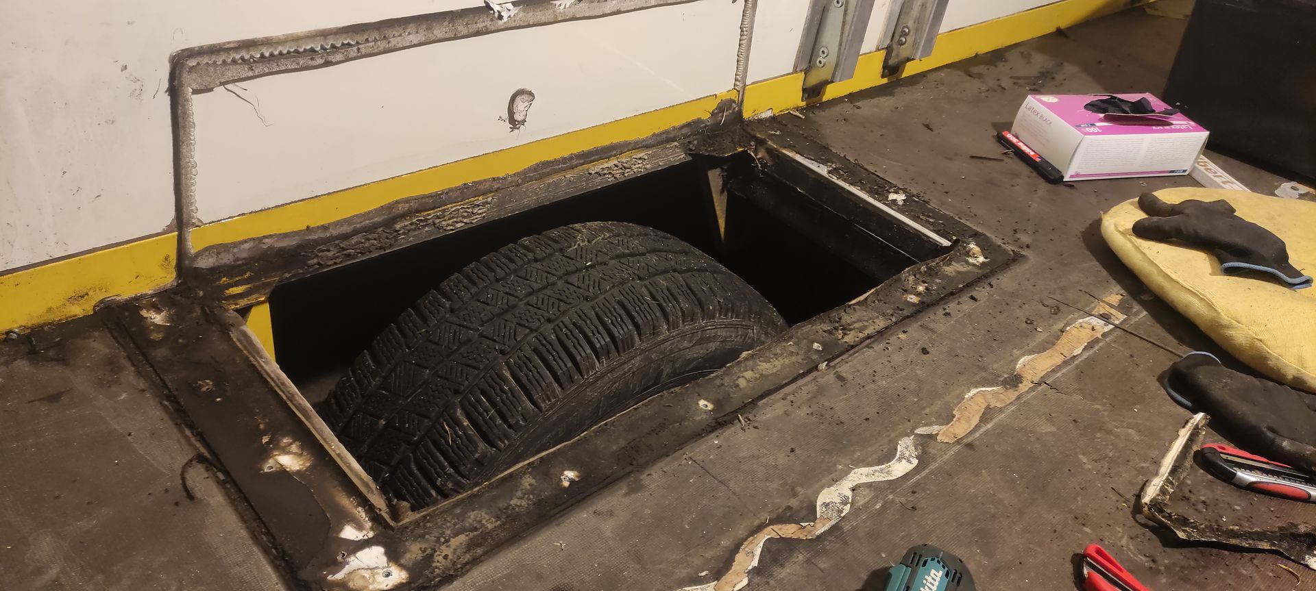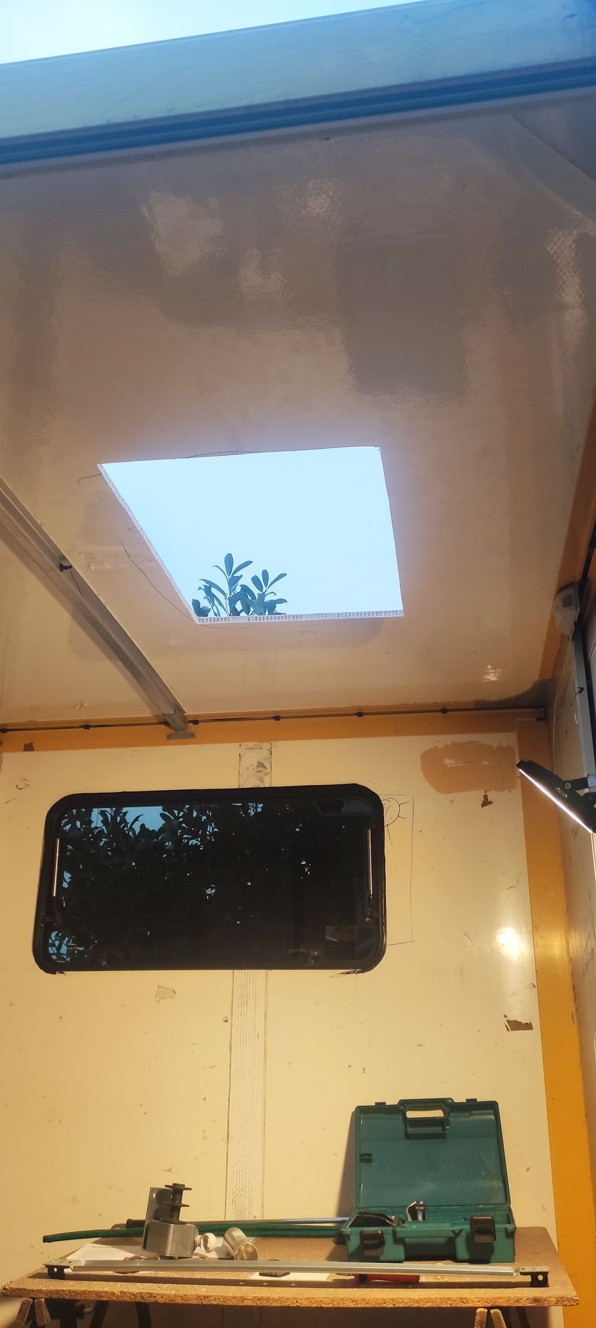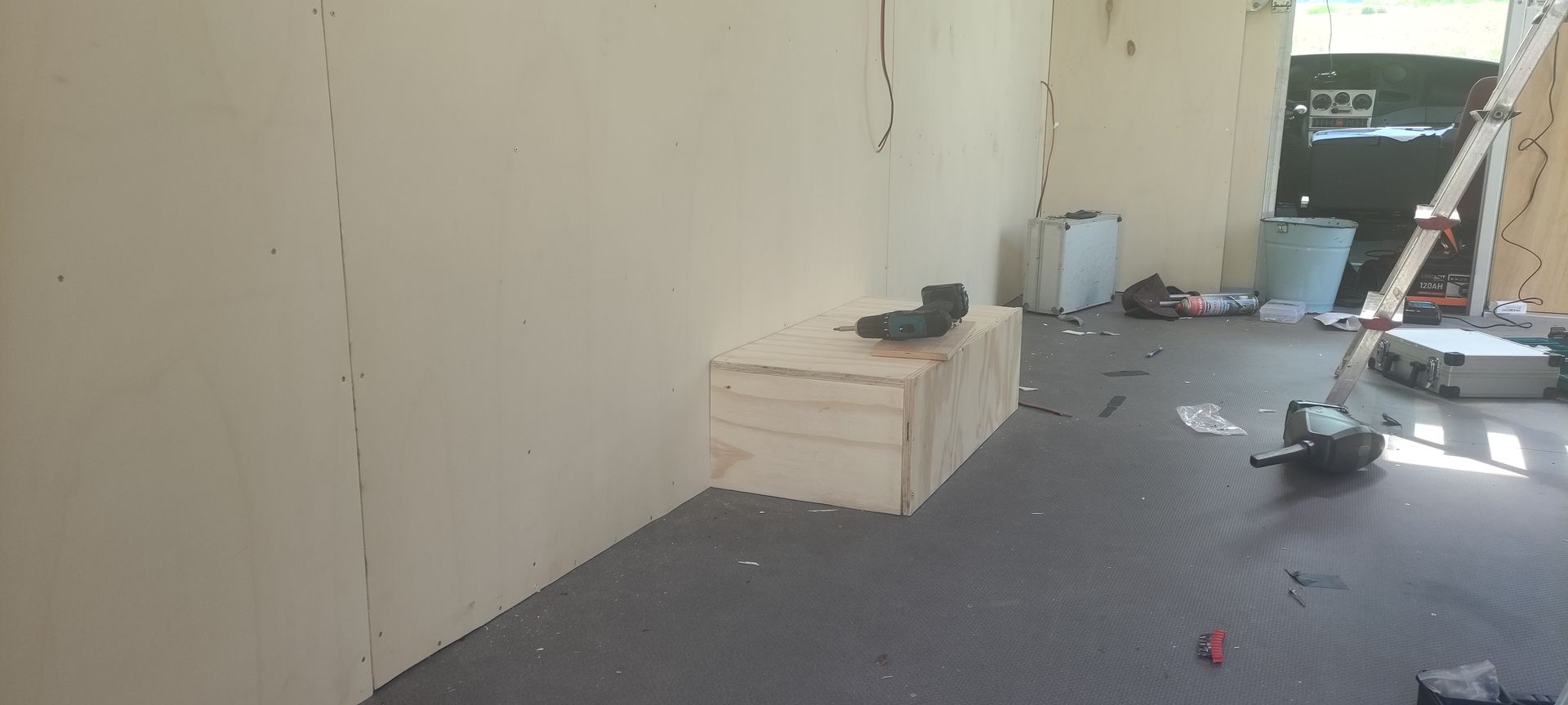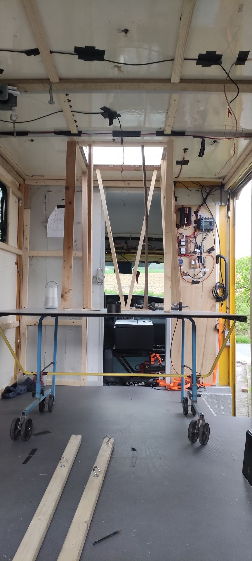 Die Vorrichtung und Halterung für das Hubbett musste ganz zu Anfang rein. Dann alles wieder ausgebaut um die Isolierung Elektrik etc. Einzubauen... O