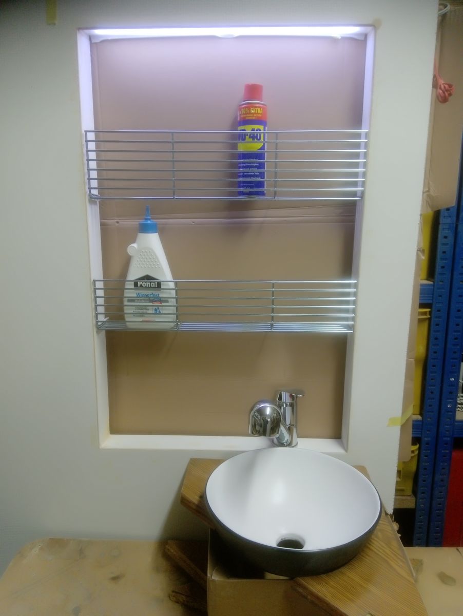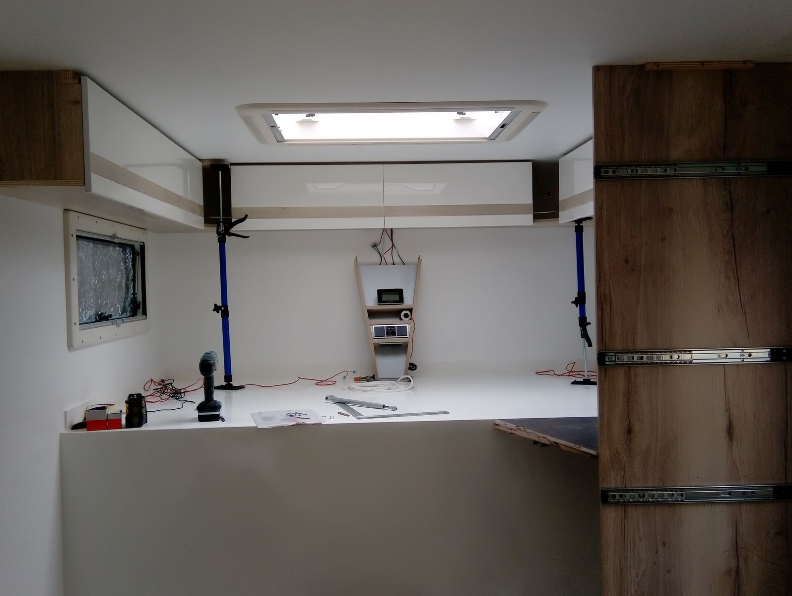 fertig bin ich noch lange nicht, Schubladen bauen, Satanlage und TV einbauen, Kameras programieren, Kleinteile einräumen, Elektronik testen und vervollständigen......