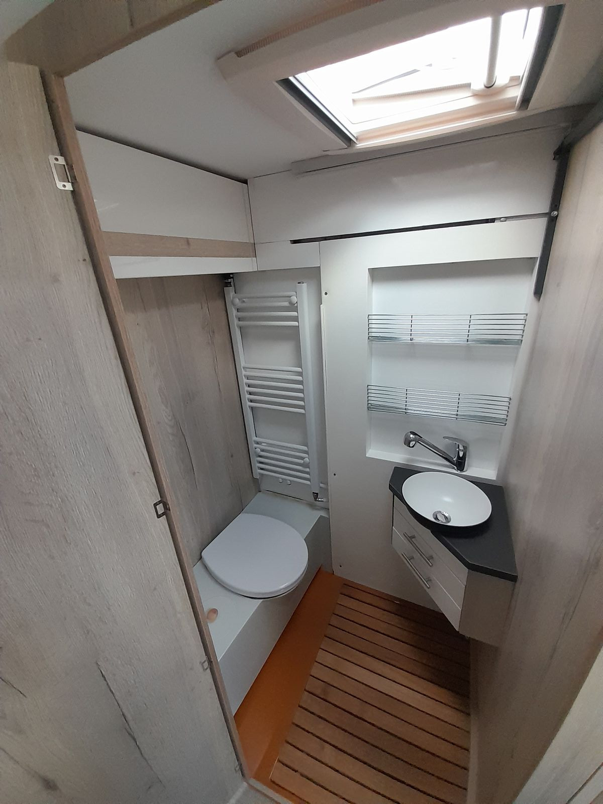 die Nasszelle mit verschiebbarer Trennwand = allgemeine Benutzung/Dusche =