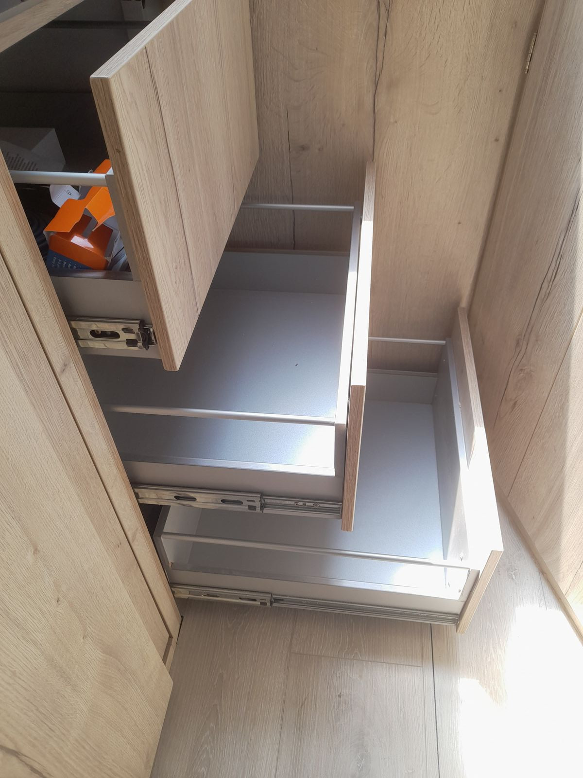 1. Die Push to open Einzüge halten nur bis etwa 15 kg stand, alle schwereren Schubladen wurden mit zusätzlichen Schnapper, teilweise 2 Stück gesichert.