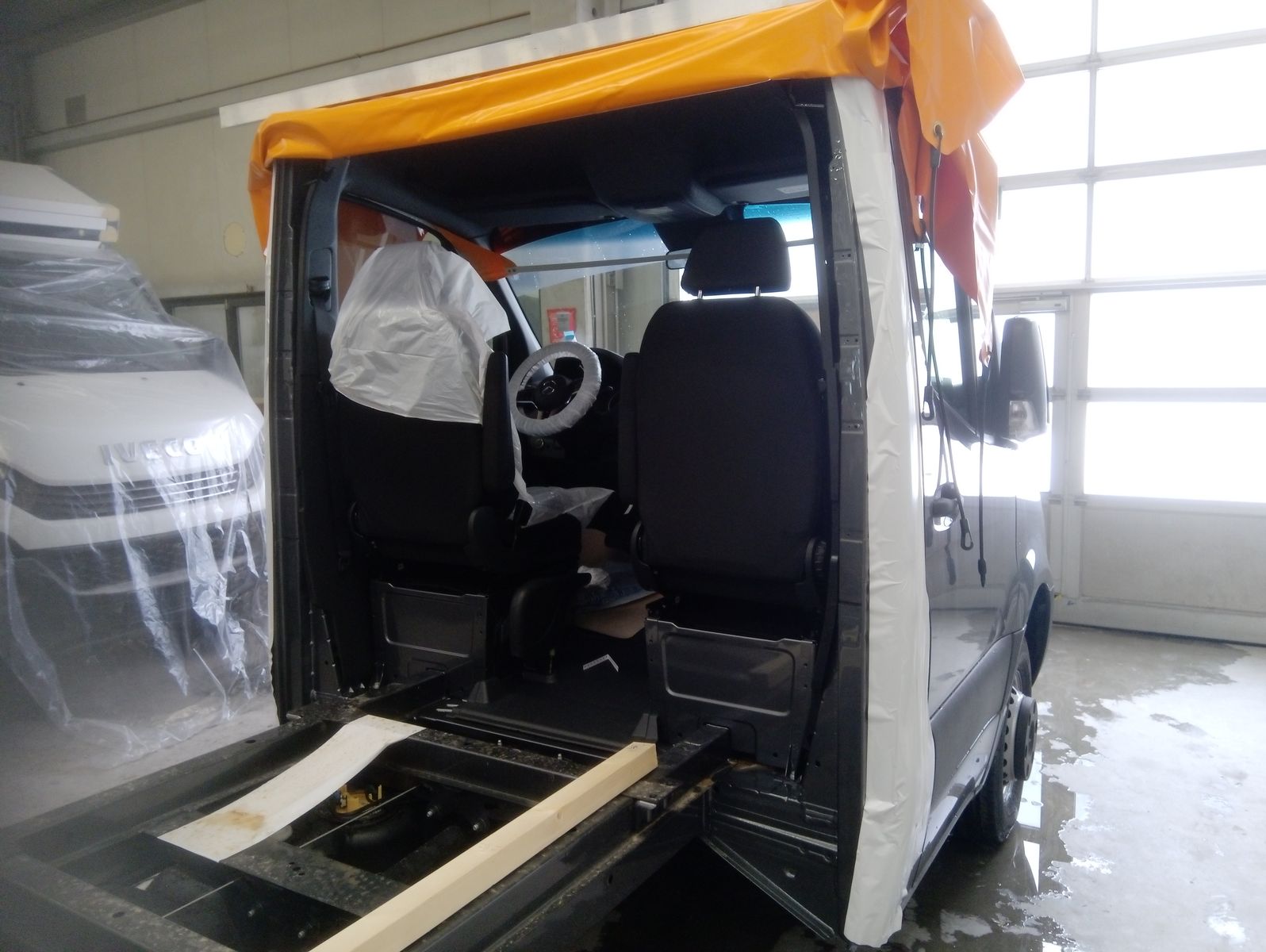 Seid der Planung im Sommer 2020 ist nach der Fahrzeuganlieferung im Februar 2021 einiges passiert, Ein Mercedes Sprinter 519 CDI mit allen Assystenten wird mit einer Ormocarkabine zum Teilintegrierten verwandelt.