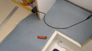 Linoleumboden ist eingeklebt, war etwas schwierig da sehr zerklüftet und extrem widerspenstig aber wenn einmal verlegt wirklich tip top , jedem PVC Boden vorzuziehen