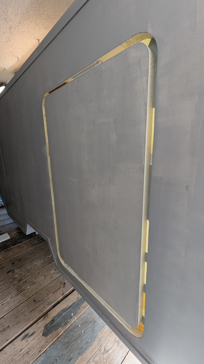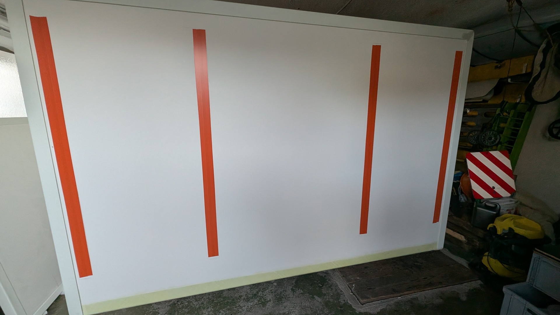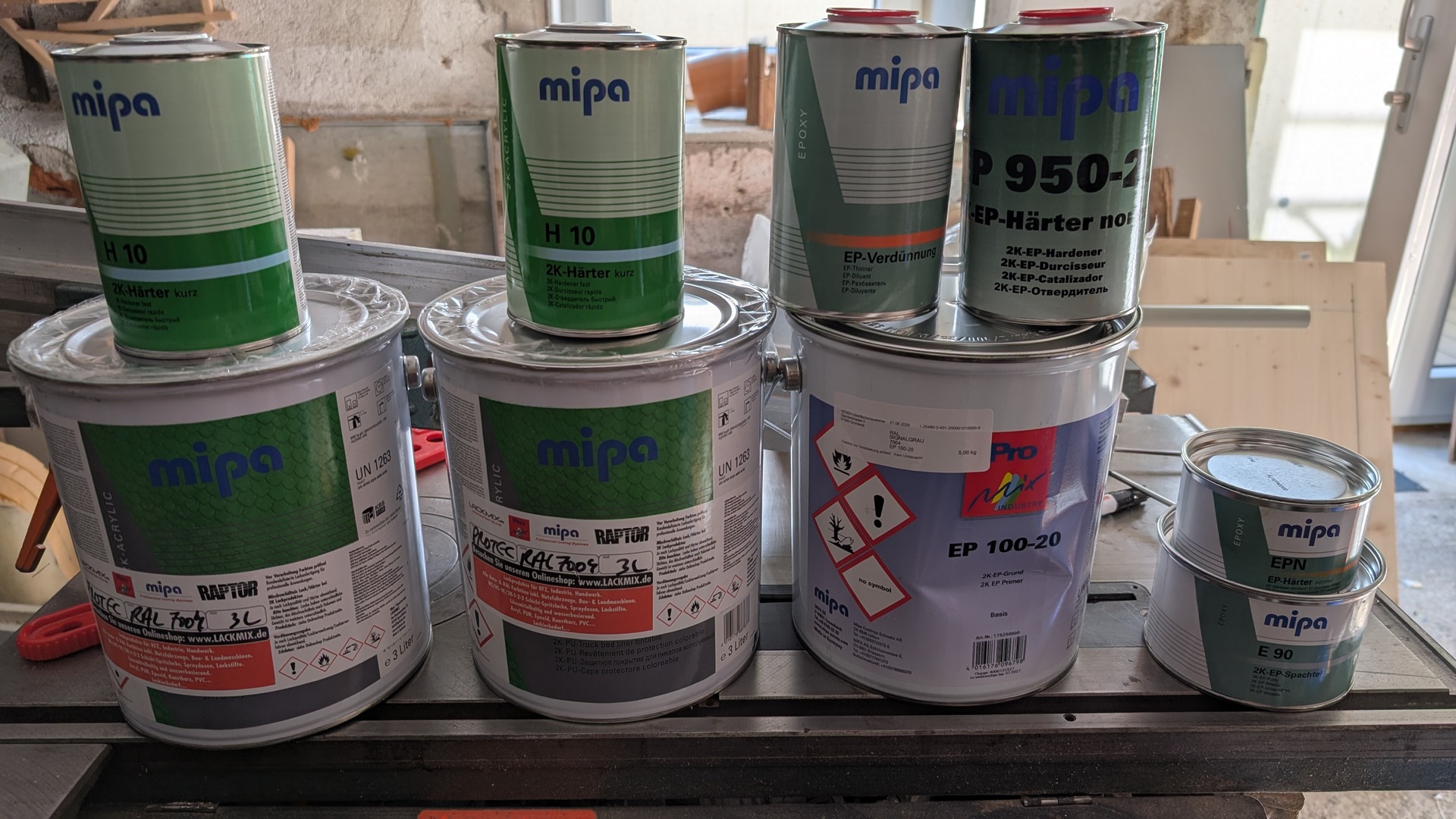 Inzwischen habe ich die Box gespachtelt, geschliffen (180) und mit Mipa Protector RAL 7004 mit der Walze lackiert.