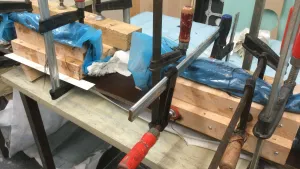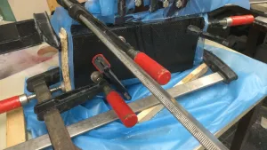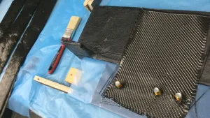 Form mit Schraubpunkten für die seitliche Rahmenbefestigung bauen, unidirektionale Kohlefaserstränge nass um die Schrauben und die Ecken des Trägers herumlegen