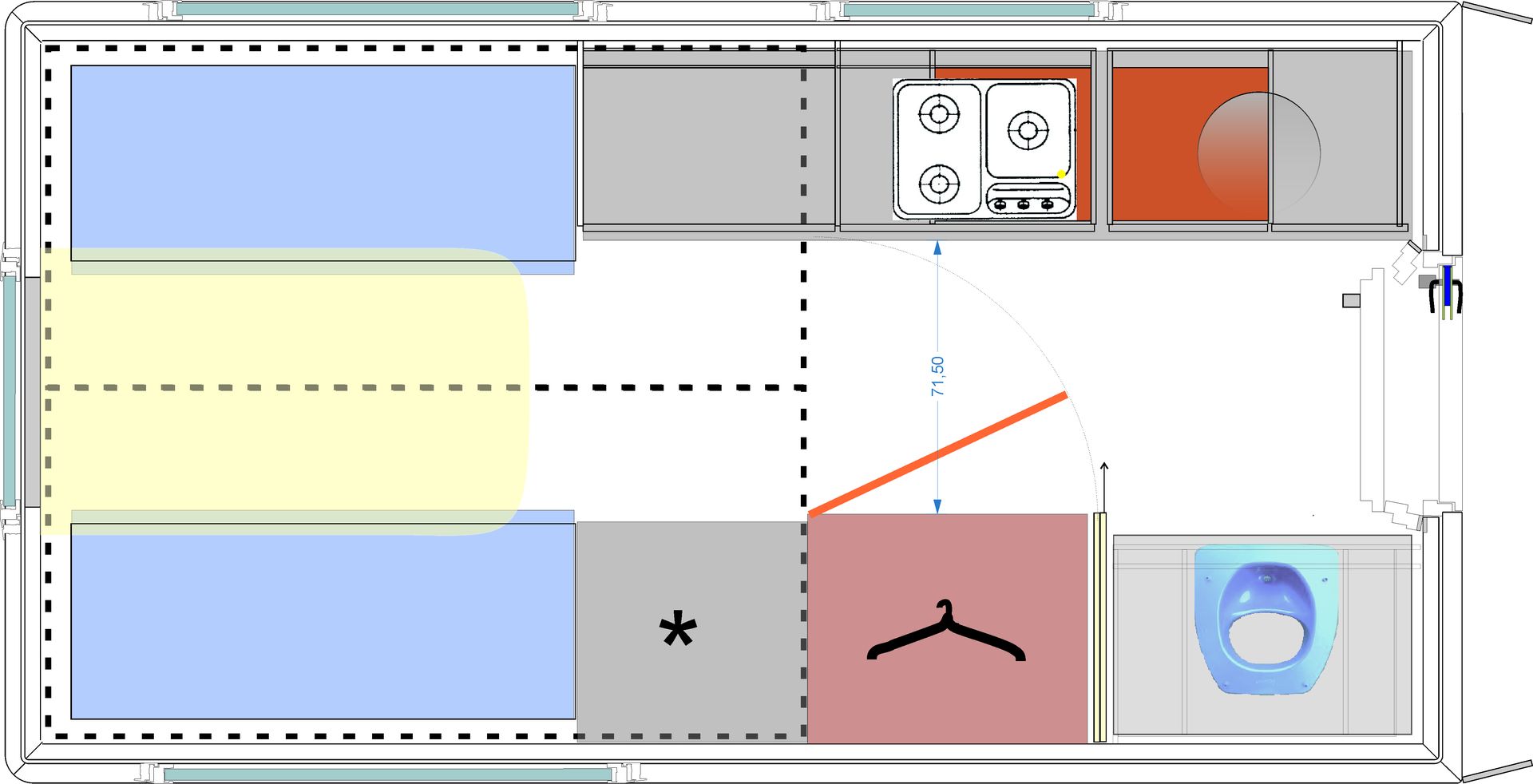 Anfangen möchte ich mit dem Grundriss: Eingang hinten, im Eingangsbereich die Dusche (80x90 cm), links eine Sitzkiste zum Schuhe ausziehen, bei hochgeklapptem Deckel eine Trenntoilette.