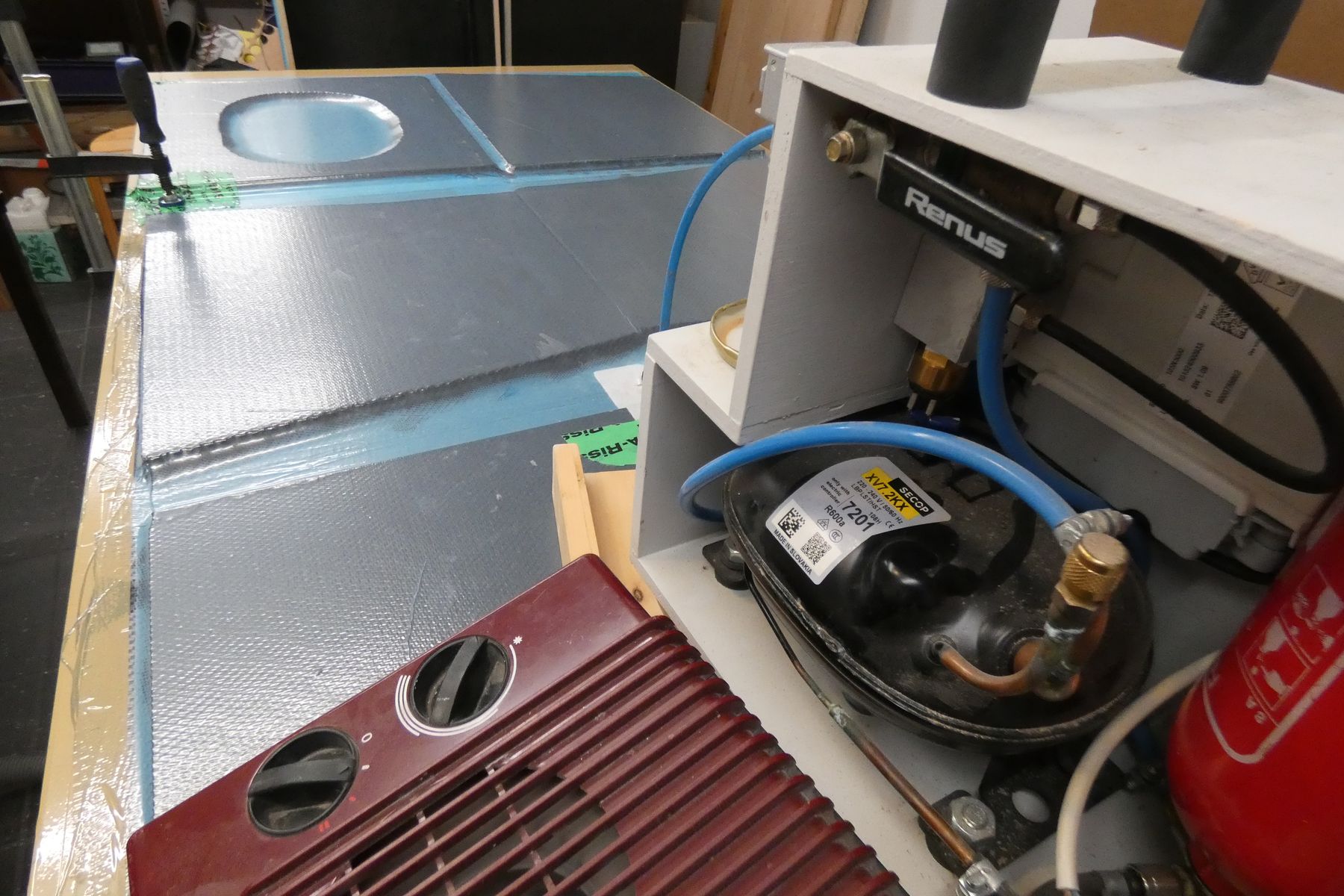 Der Deckel war etwas aufwändiger, da er wasserabführend schräg in Richtung Duschwanne verlaufen und an den Seiten eine Aufwölbung haben soll. Darüber haben wir nämlich die Wäscheleine geplant. Dazu wurde eine Wabenplatte mit Styrodur eingefasst, an der hinteren Kante Holz zum Verschrauben des Stangenscharniers.