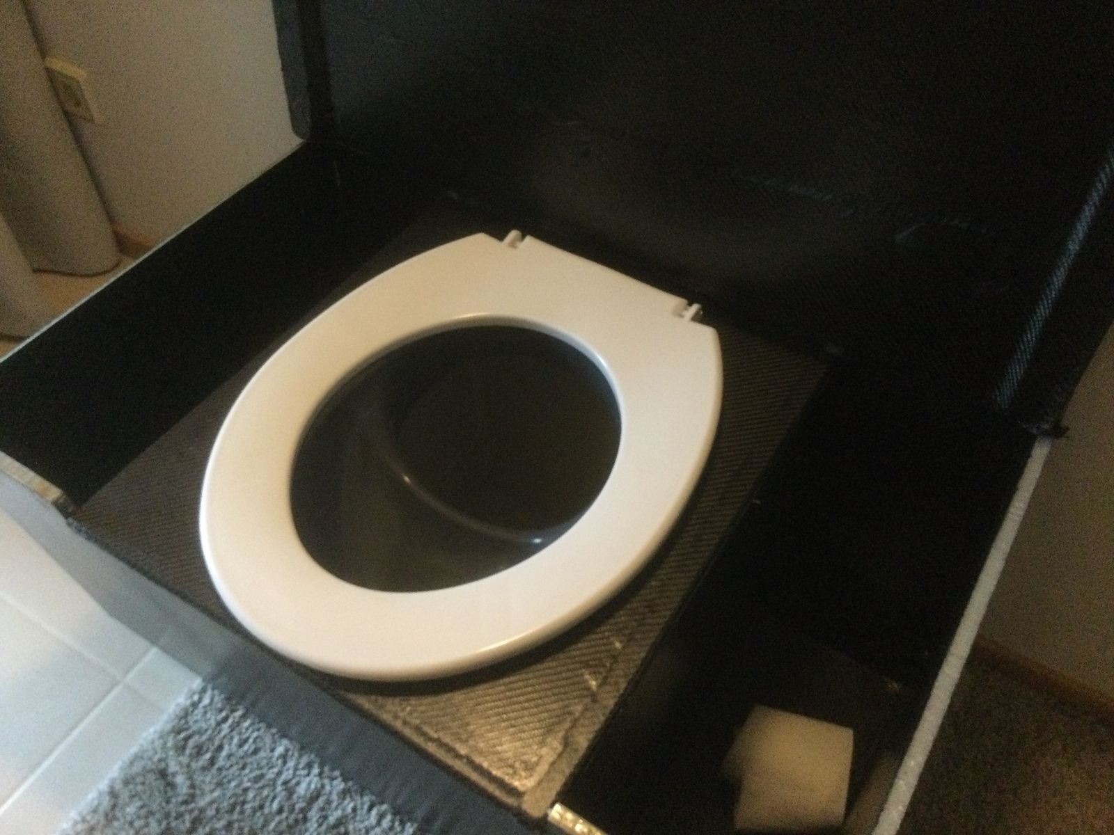 Den Aufbau habe ich hier nicht wieder mit einer Negativform gemacht, sondern Platten laminiert, mit der Kreissäge zugeschnitten und zusammengeklebt. Links und Rechts von dem Toilettenkern sind Fächer zum Verstauen von Klopapier, Tüten, Einstreu...