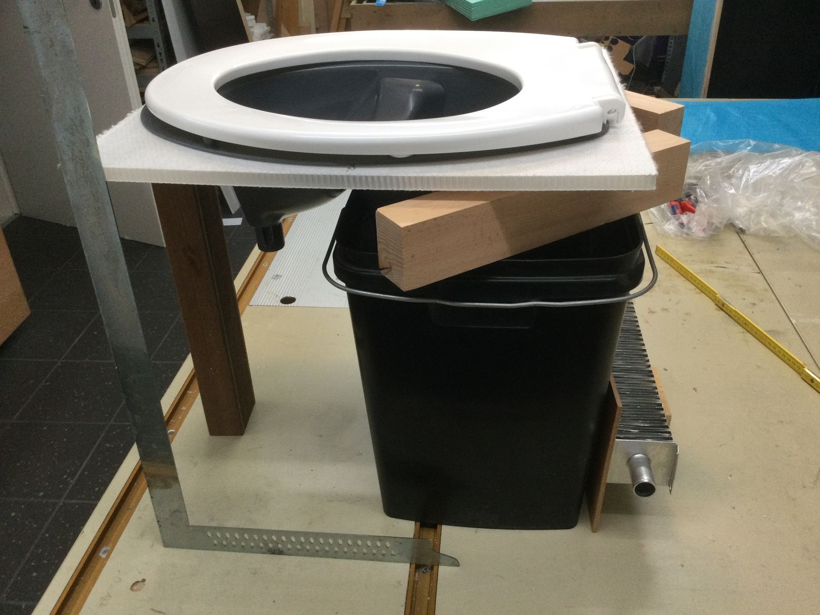 Die Platten sind unterschiedlich dick. Reste der Wabenplatten stützen die Klobrille nach unten ab, Trittschalldämmungsreste sind in den Verkleidungen verbaut. Der Trittschallschaum war so weich, dass sich die Absaugglocke in die Platte gedrückt hat. Aber er muss ja nichts tragen, sondern nur die Heizungsluft von dem Feststoffbehälter trennen.