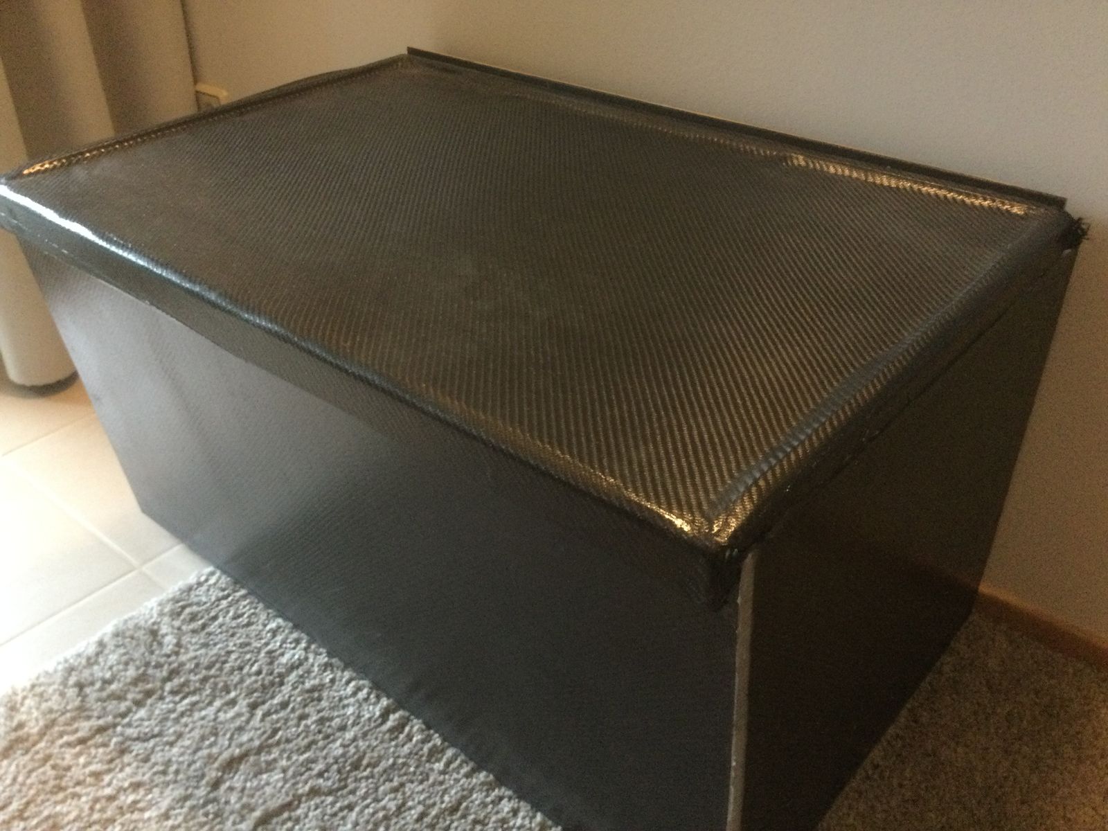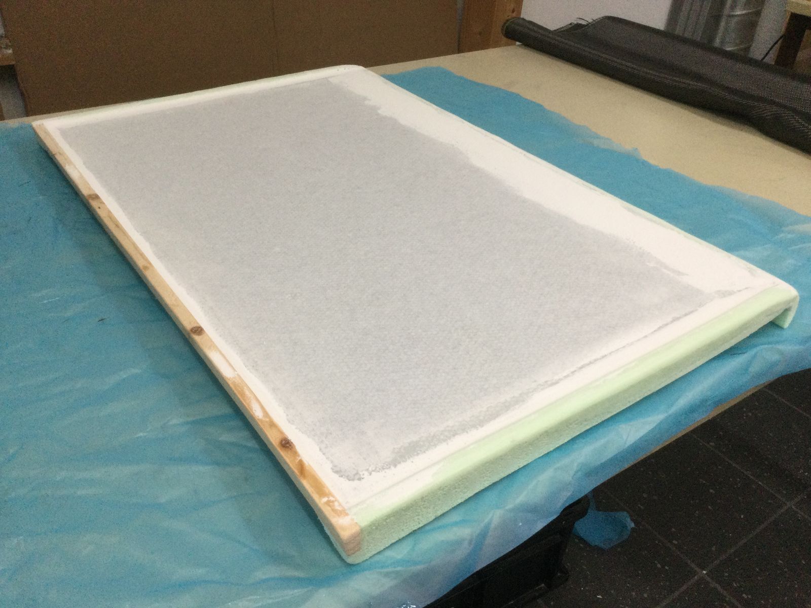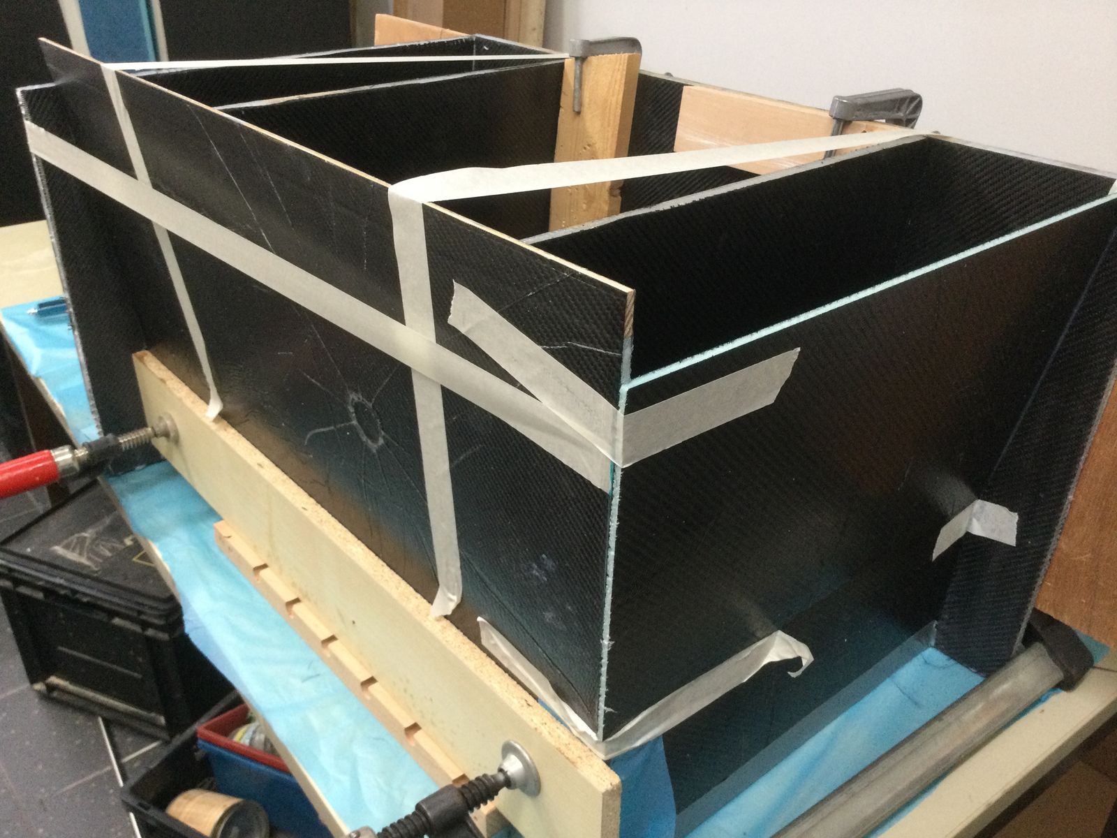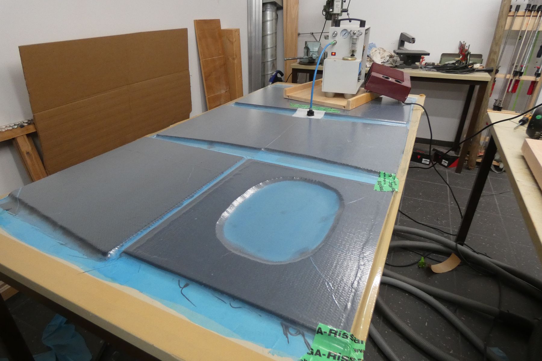 Nach dem Rundschleifen und Spachteln wurde der Deckel unter Vakuum mit Kohlefaser umhüllt.