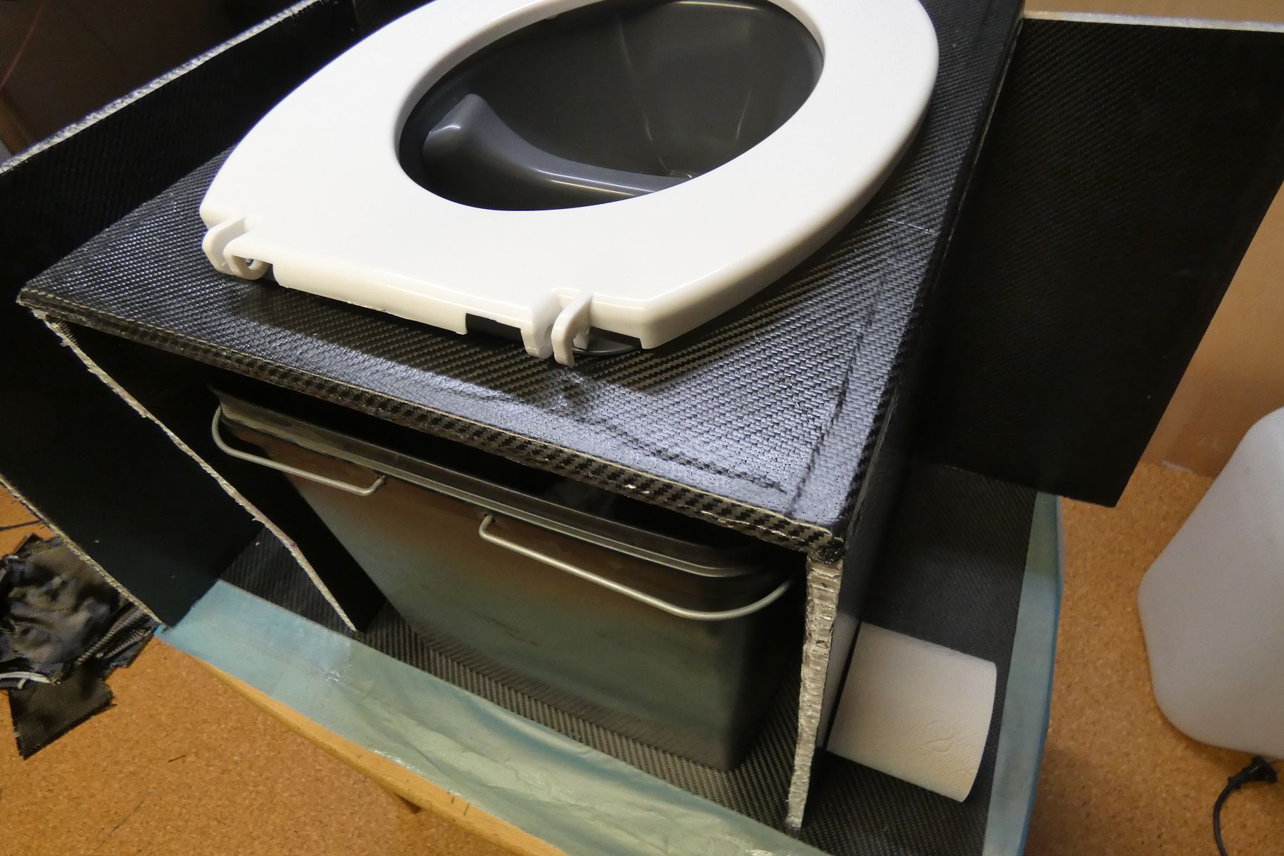 Den Aufbau habe ich hier nicht wieder mit einer Negativform gemacht, sondern Platten laminiert, mit der Kreissäge zugeschnitten und zusammengeklebt. Links und Rechts von dem Toilettenkern sind Fächer zum Verstauen von Klopapier, Tüten, Einstreu...