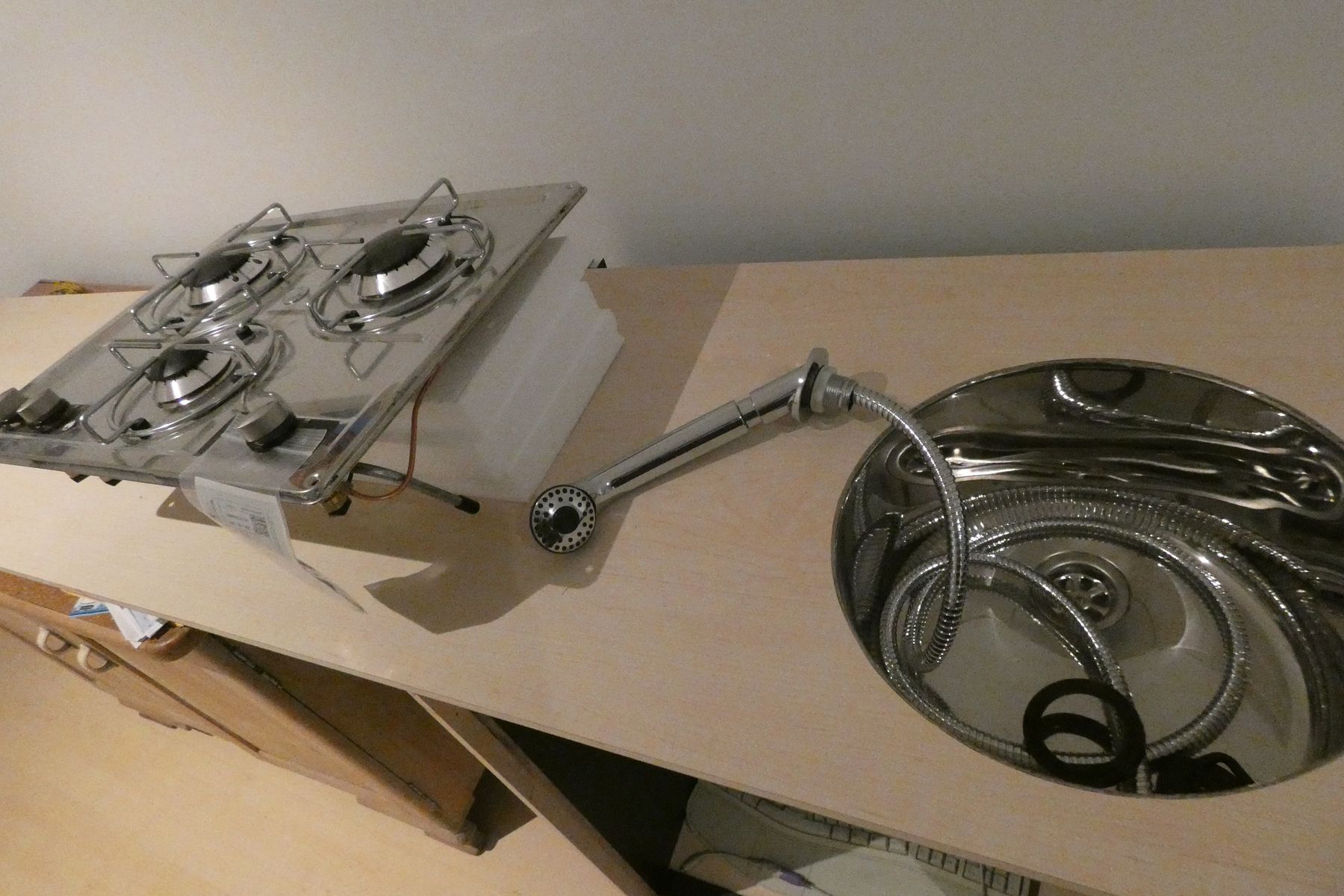 Die Steifigkeit kann nicht mit Kohlefaser mithalten, durch die Unterstützung der Schränke könnte man aber darauf Schnitzel klopfen. Zum darauf rumhüpfen, was ich gerne zu Testzwecken mache, reicht die Deckenhöhe nicht aus. Die Abmessungen: 218 cm x 50+Frontleiste cm, Gewicht mit Spülbecken ohne Herd 5,5 kg. Ich bin froh, den Ausschnitt für den Gasherd, auf den ich 7 Monate gewartet habe, noch nicht gemacht zu haben. Vielleicht wird es ja doch noch eine Spiritus-Induktionslösung.