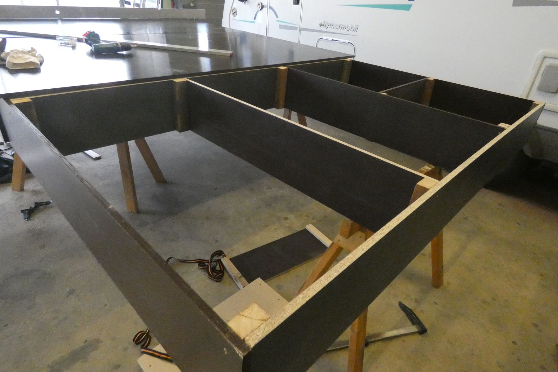 Ich hatte im August 2021 die Möglichkeit in eine in 3 Minuten fussläufig erreichbare Halle in der Nachbarschaft einzuziehen. Zuerst habe ich mir aus Siebdruckplatten und Holzresten eine stabile, gerade Plattform gebaut, wo man die grossen Teile drauf laminieren kann. Die Schraubenlöcher wurden verspachtelt, die Platten untereinander luftdicht verklebt. Leider bedeutet 18mm Siebdruck nicht, dass alle Platten gleich dick sind.
