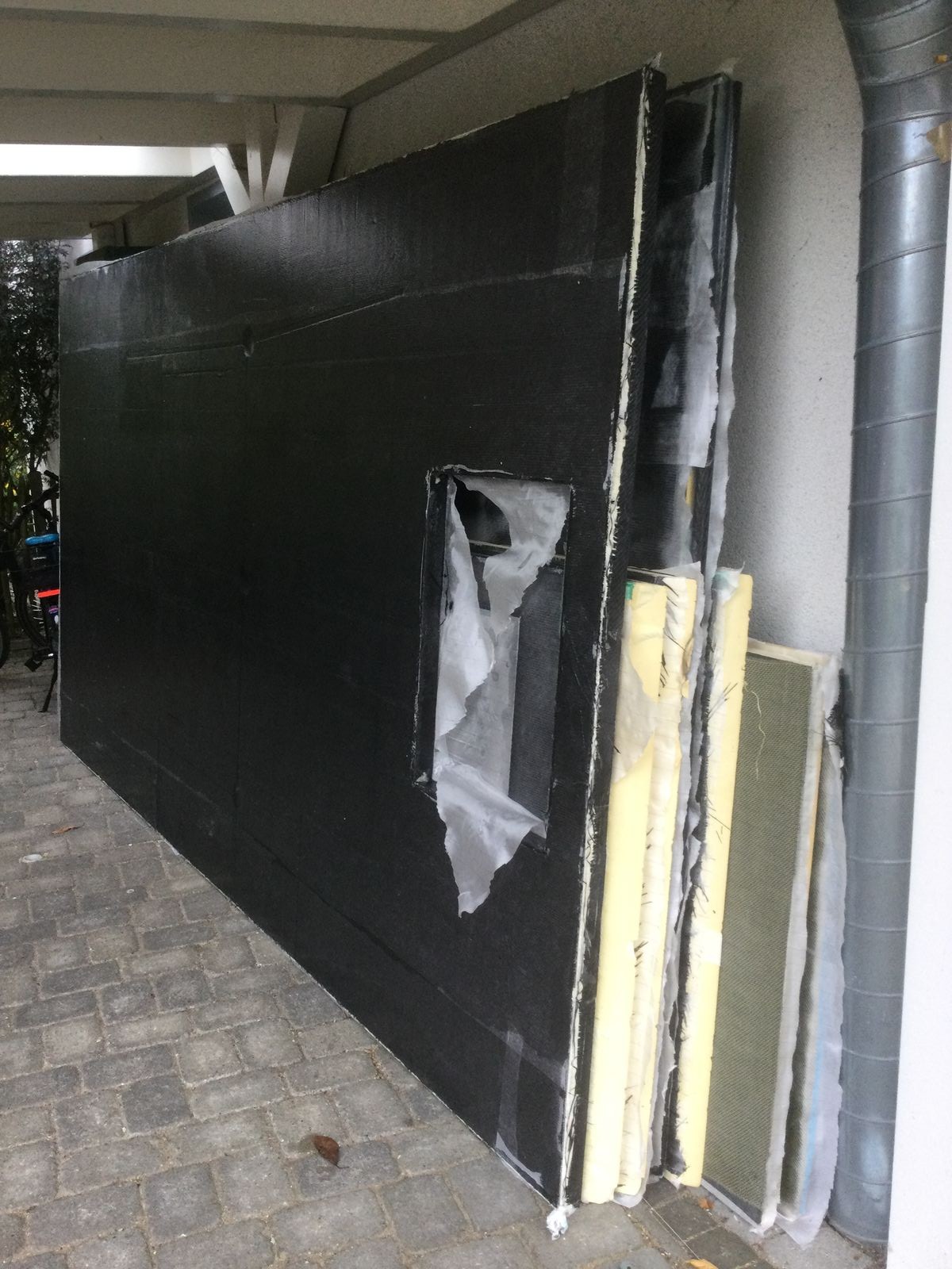 Die Fasermatten mussten nach dem Auflegen direkt mit einer mikroverzahnten Schere geschnitten werden: an den Kanten bündig, zurückgesetzt oder um die Ecke herum. Auch in den Fensterlaibungen wird das Gewebe um die Ecke gelegt, so dass hier 4 Lagen übereinander kommen. Damit die beim Aushärten an Ort und Stelle bleiben, wurden die Platten der Fensterausschnitte in Vliess und Trennfolie gewickelt und in die Ausschnitte gehämmert. Ganz übel liess sich das Aramidgewebe schneiden. Da habe ich mir Hilfe von Zuhause und den Nachbarn geholt, damit mir die Zeit nicht davon läuft.