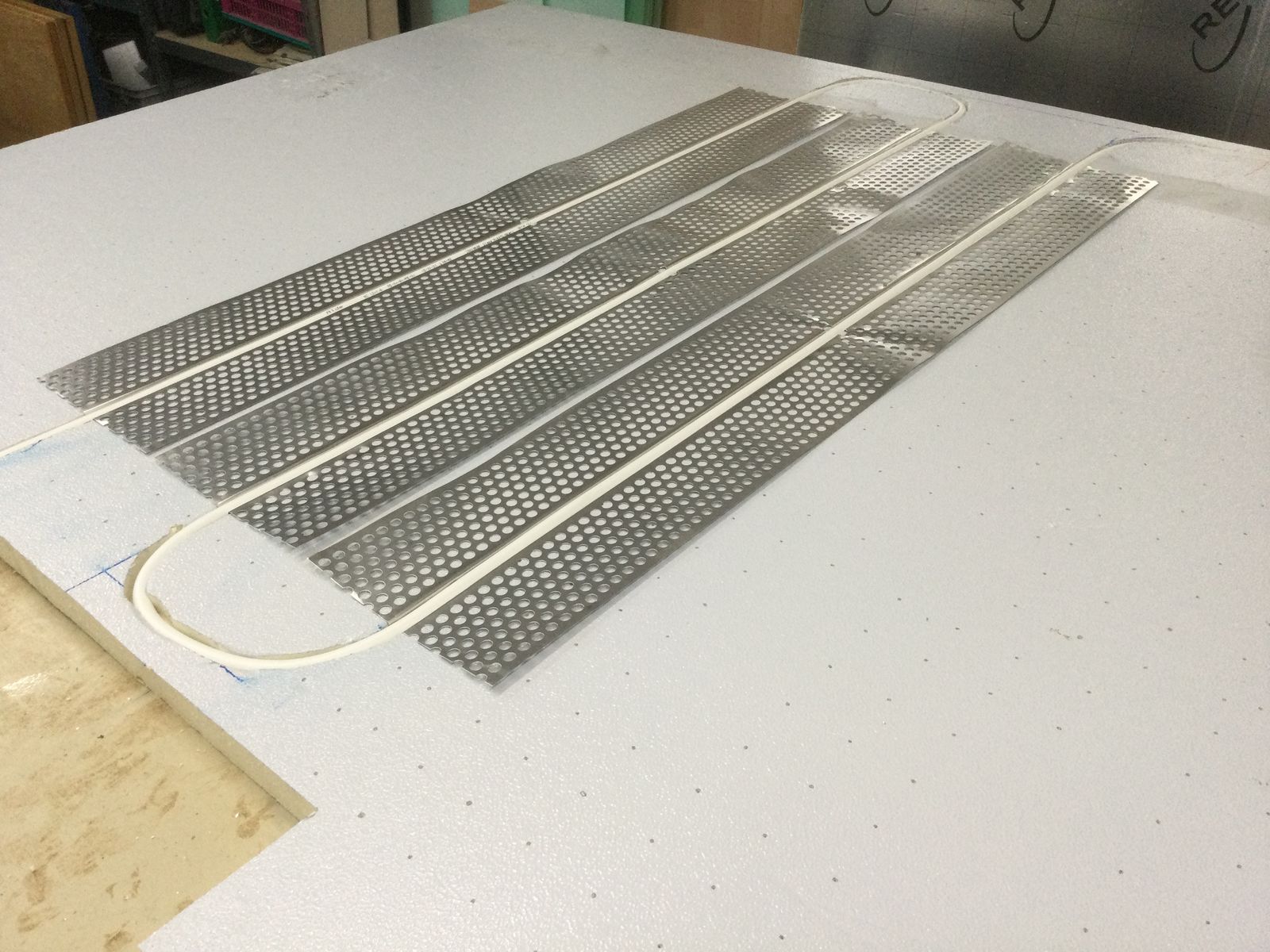 Die Papp-Alu-Beschichtung der Platten war ausreichend fest mit dem Schaum verklebt. Trotzdem habe ich die Flächen mit einem Nagelbrett gelocht, mit Schleifpapier angerauht, gereinigt und mit Aceton entfettet.