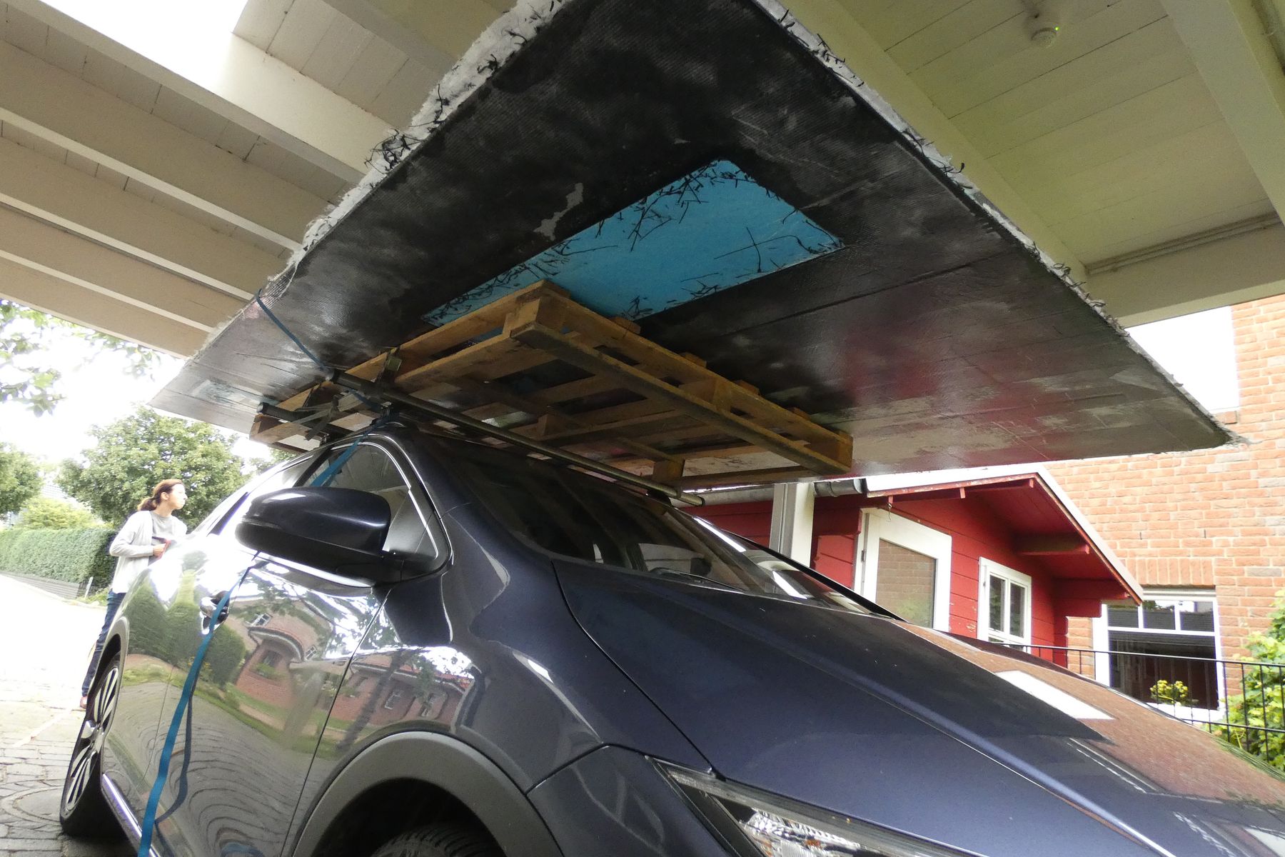 Eine Platte wurde zunächst mit Epoxidharz eingestrichen und alle Nagellöcher gefüllt, dann kam eine Lage 45° bidirektionales Kohlefasergelege 250gr/m2 darauf. Die Aussenwände bekamen als zweite Lage ein 90° bidirektionales Aramid-Kohle-Gewebe, Fussboden und Dach noch zwei um je 45° versetzte Kohlelagen. Die Innenwände des Oberteils waren zweilagig Kohlefaser, die Inneseiten der unteren Wände müssen nichts tragen und blieben einseitig belegt.