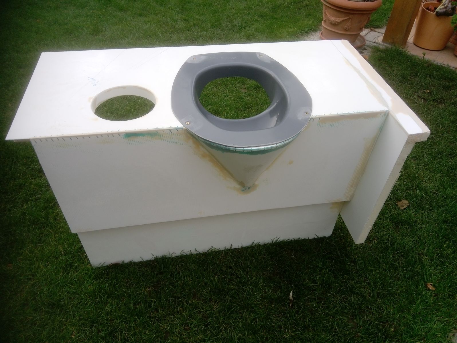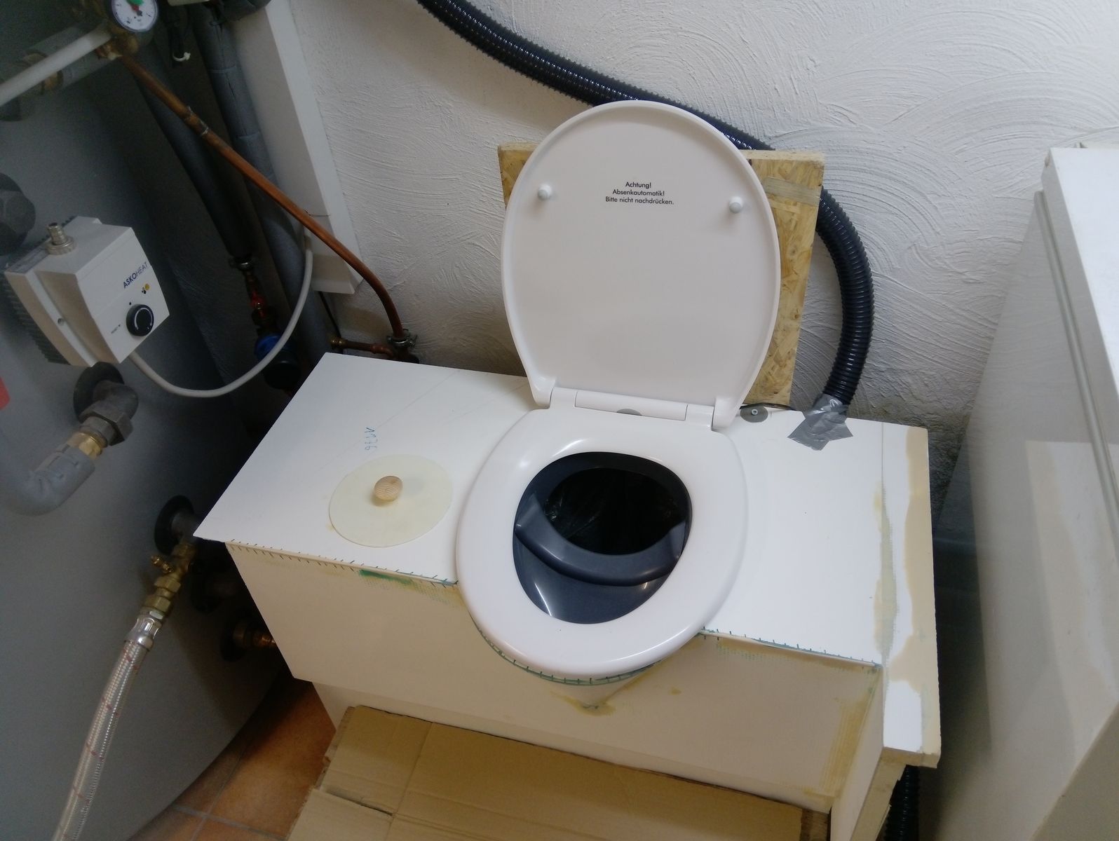 der Einsatz und der Toilettendeckel wurden gekauft, die restlichen Teile sind Made by frebeka.Feststoffe in Behälter mit 30 l Müllsack, Urin in 60 l Tank unterm Fahrzeug, die Leerung erfolgt von aussen