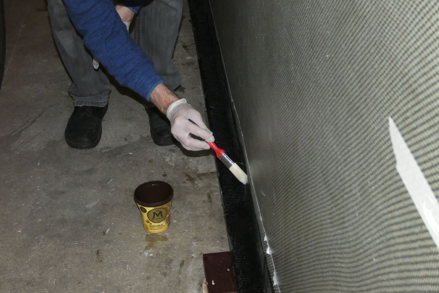 Die Platten des Hubdachs wurden mit 1cm Abstandshölzern an die unteren Wände gestellt und mit Spanngurten und Schraubzwingen fixiert. Auch hier bekamen die Ecken, zunächst nur aussen, zwei Lagen Gewebe.