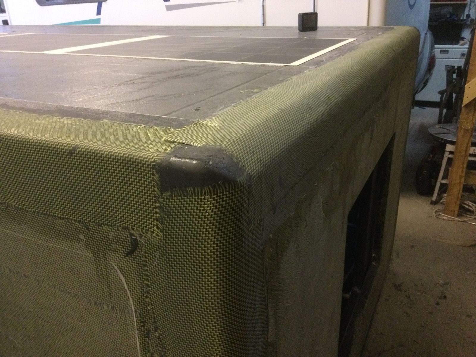 Das Dach wurde dann erstmal lose aufgesetzt und zeigte die Summe aller eingebauten Toleranzen, dann noch einmal angehoben und mit Harz aufgeklebt. Auch hier wurde mit Kohlefaser, dann mit Aramid-Kohle der Übergang laminiert.