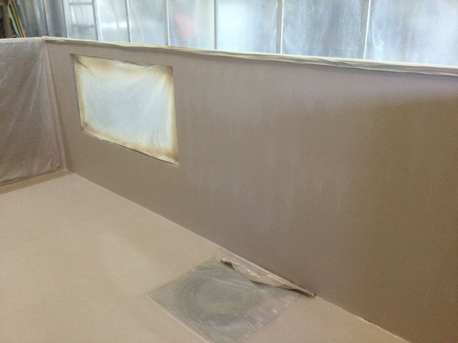 Nachdem die Innenseite des Deckels fertig gespachtelt war, wurde grundiert und noch einmal fein geschliffen. Meine Designerin hat sich bei Caparol Farben ausgesucht: Die Wand zu Fahrerhaus dunkler (Nutria 12), der Rest Nutria 14. Mein Lieblingsfarbenmischer hat das dann auf Rucopur 3000 PU-Lack übertragen und die Stirnwand hat diesen Farbton bekommen.