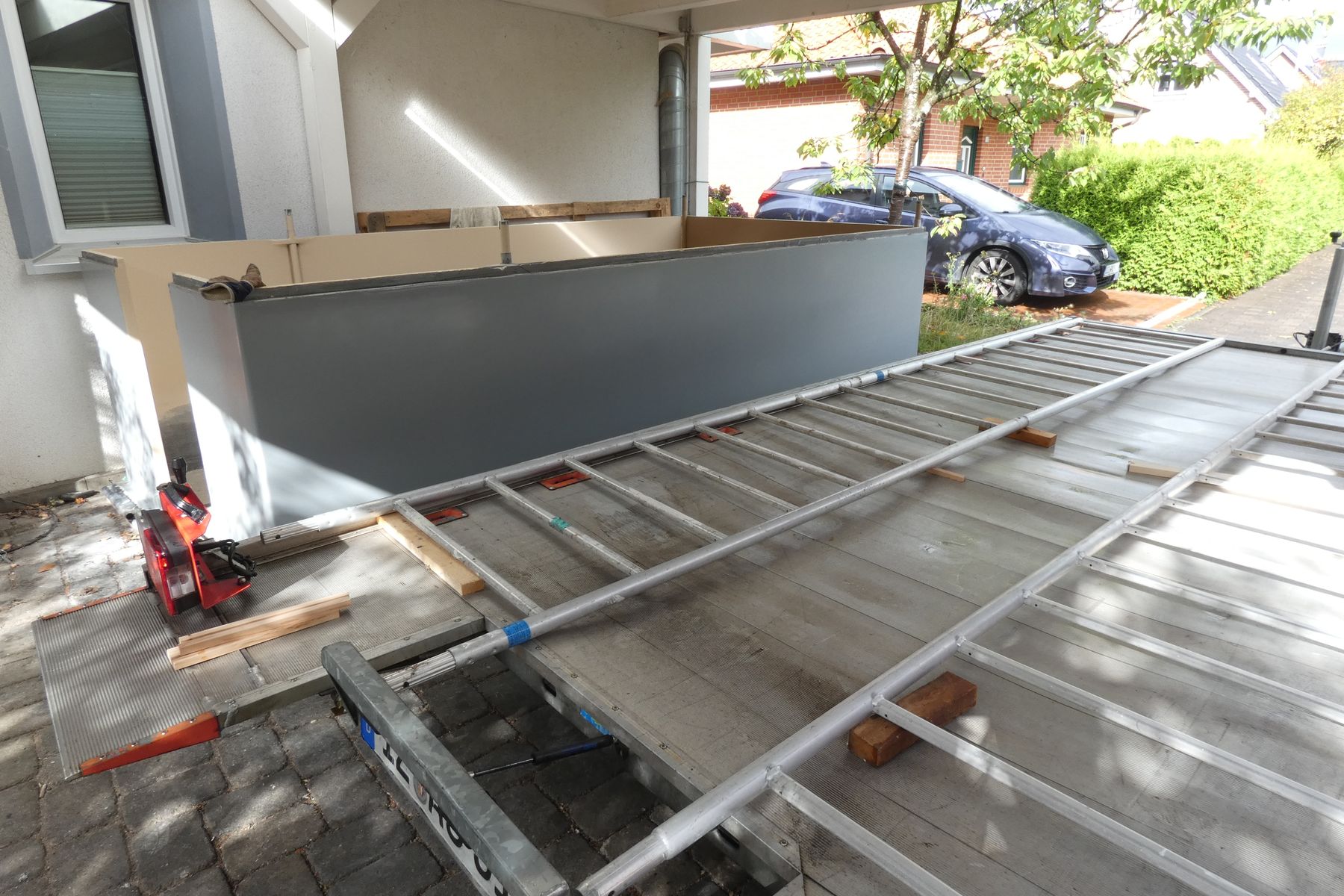 Und im Carport wieder abgesetzt, mit 6 starken Männern, meinem Sohn und meiner Frau. Im Carport hätte ich den Deckel wegen der überstehenden Hubspindeln nicht aufsetzen können, da die Höhe fehlt. Wenn ich den Deckel demnächst mit den Spindeln um einen Meter anhebe, habe ich noch 1,5 cm bis zum Carportdach.