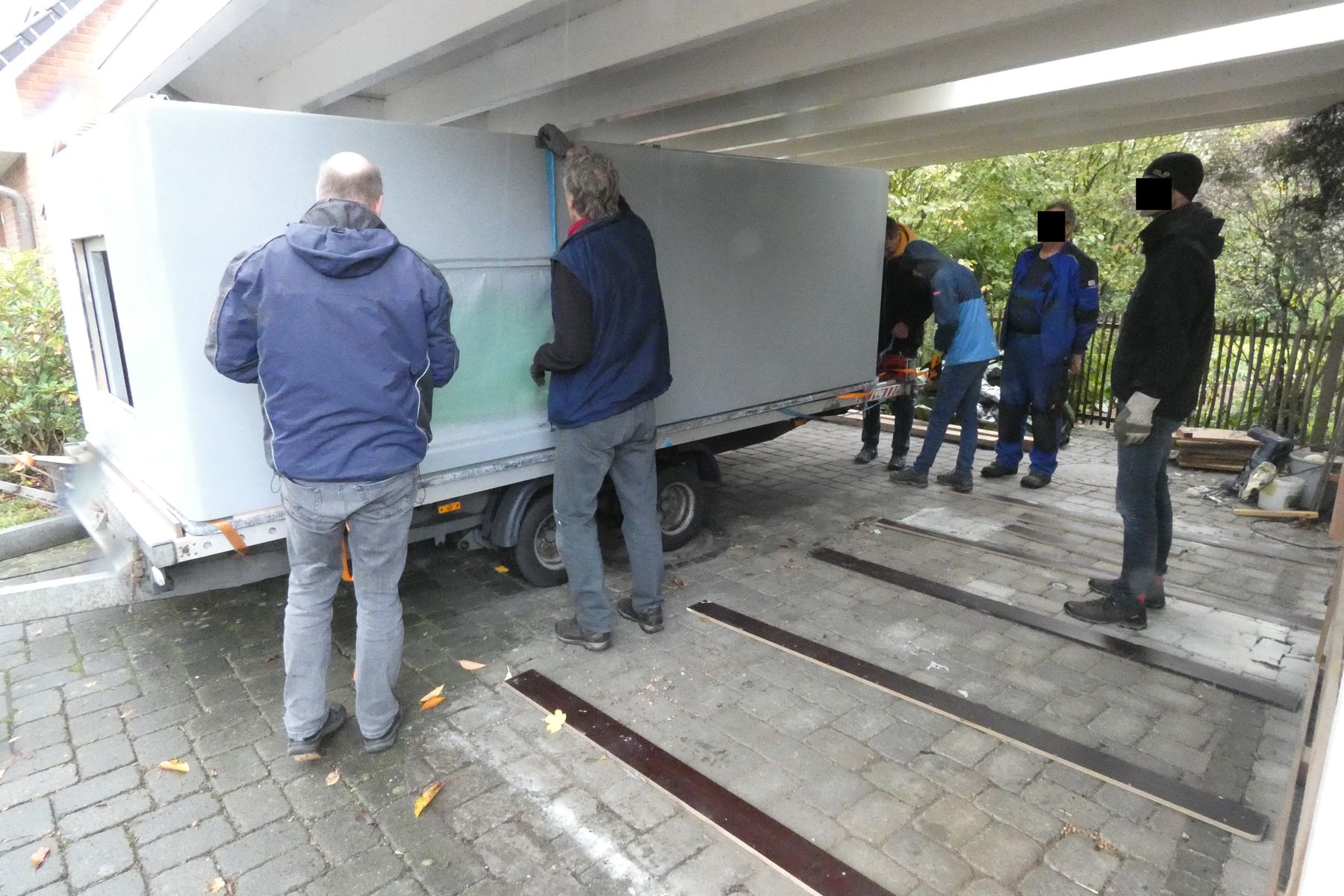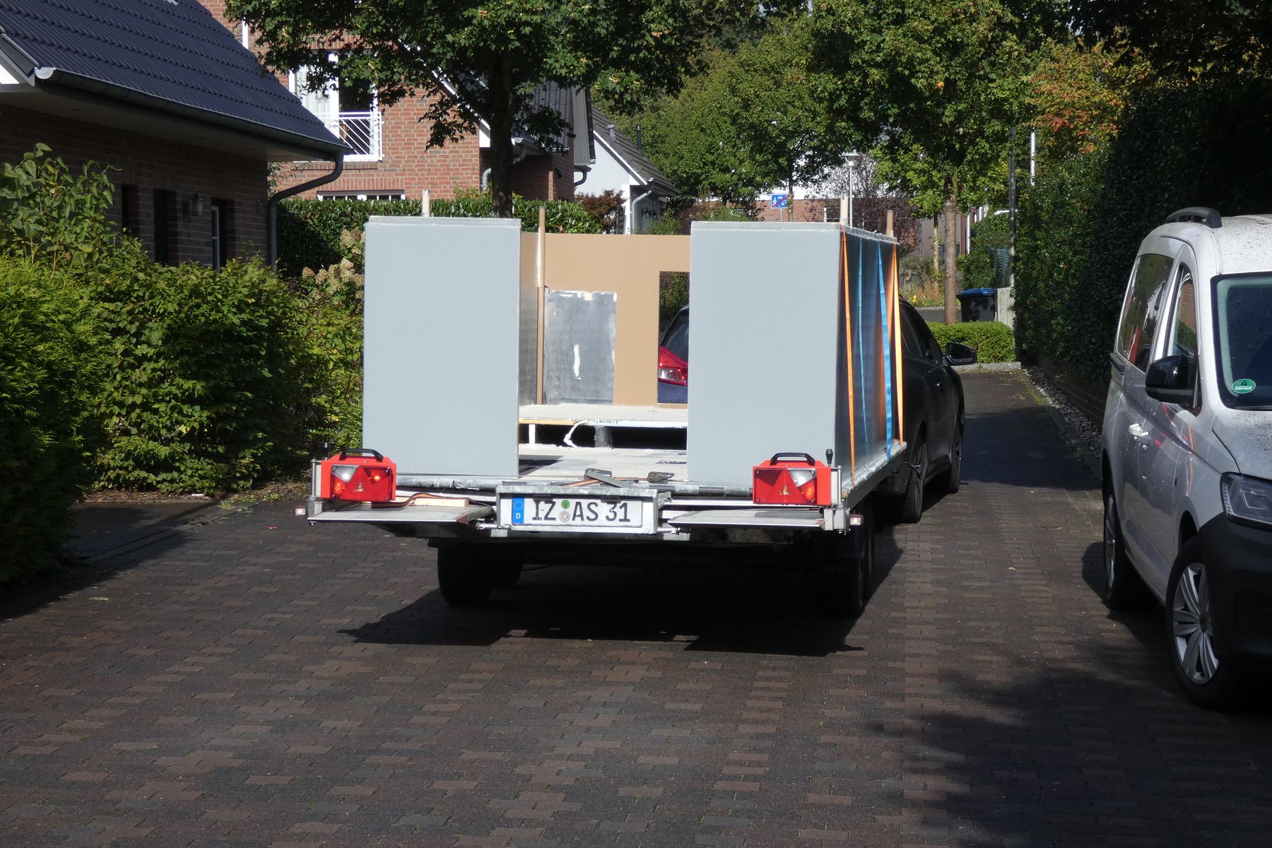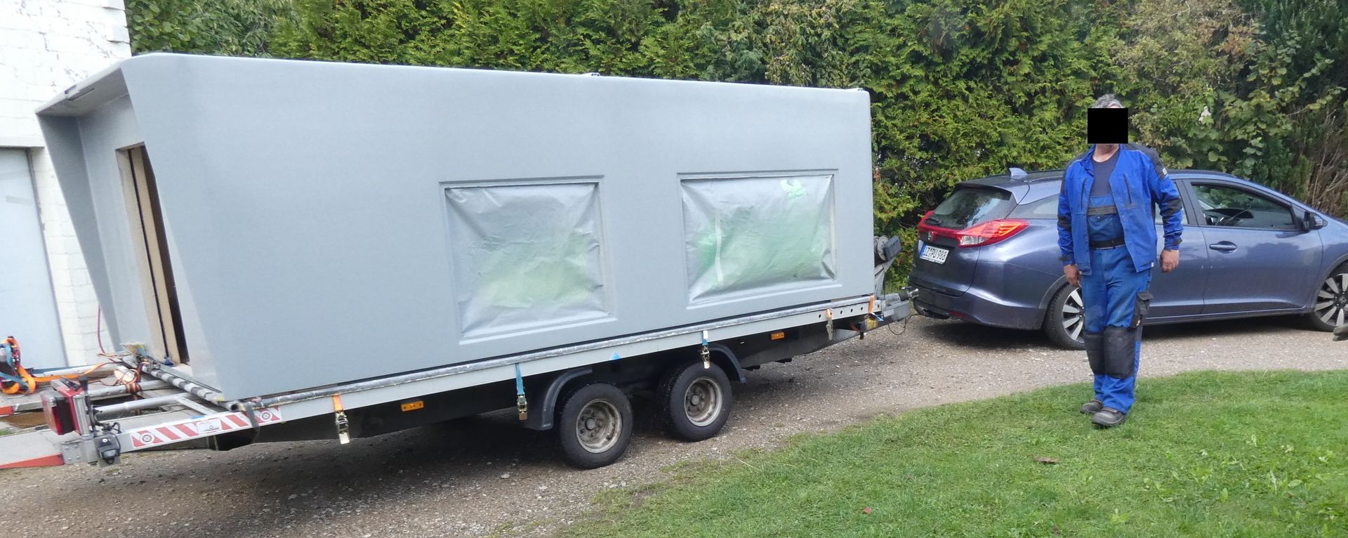 Mindestens 3 Monate nach meinem Zeitplan, nach langer Krankheit und einem schönen Familienurlaub ging es endlich weiter. Ich habe die richtige Farbe bekommen und Ober- und Unterteil fertig lackiert. Heute habe ich Freunde und Nachbarn eingeladen. Wir haben das Unterteil auf einen Trailer gesetzt, den Deckel aus der Halle geholt und den zusammen gefahrenen Aufbau ins Carport gestellt. Auch wenn es optisch passt, es soll kein Wohnwagen werden.