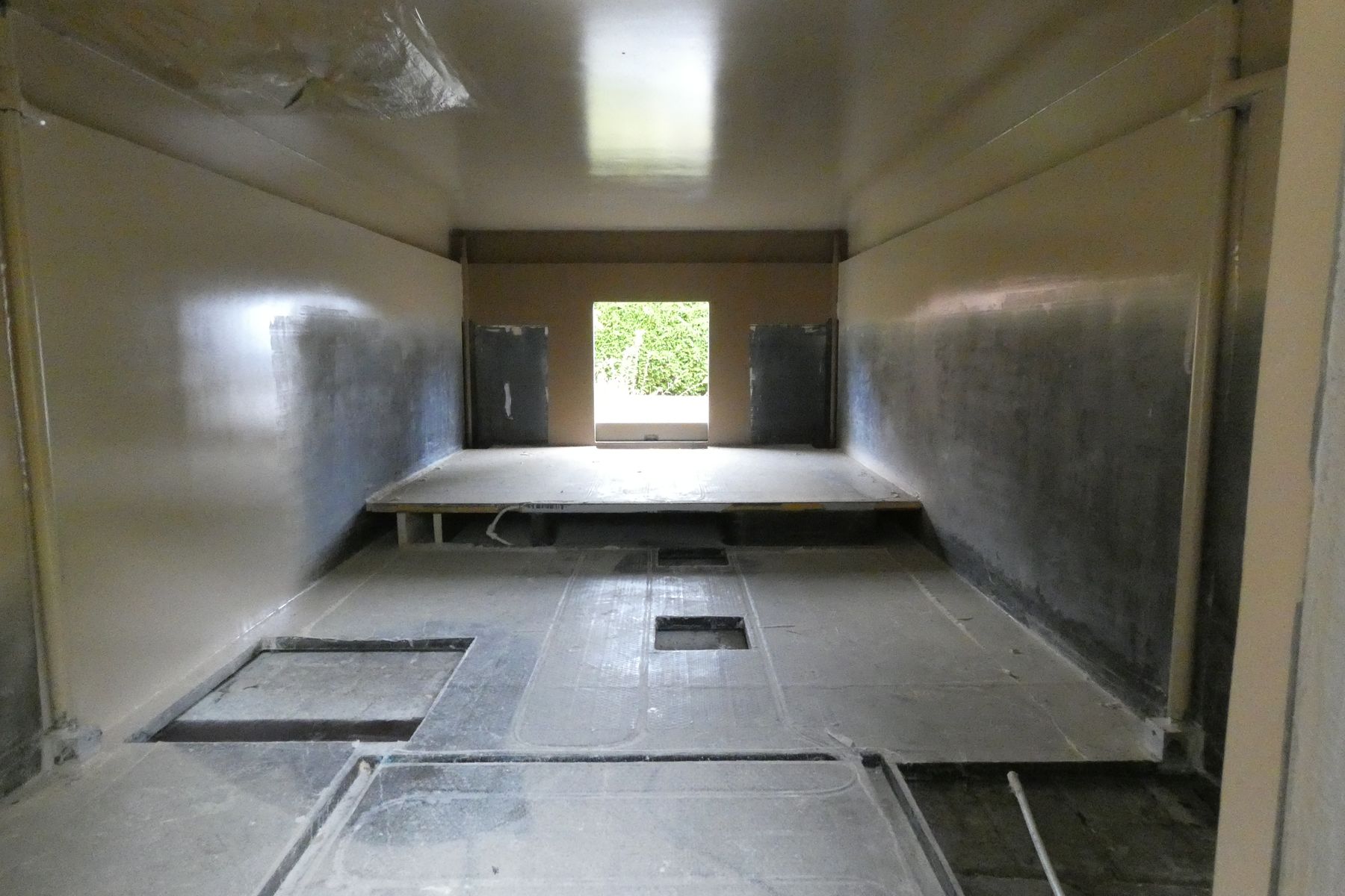 Hier noch mal ein Blick ins Innere, Richtung Fahrerhaus-Durchschlupf, es sind nur die später sichtbaren Flächen lackiert. Vorne die Duschrinne, links und rechts Öffnungen zum Keller, zwei Revisionsöffnungen für die Wassertanks und das erhöhte Podest für die Sitzgruppe.