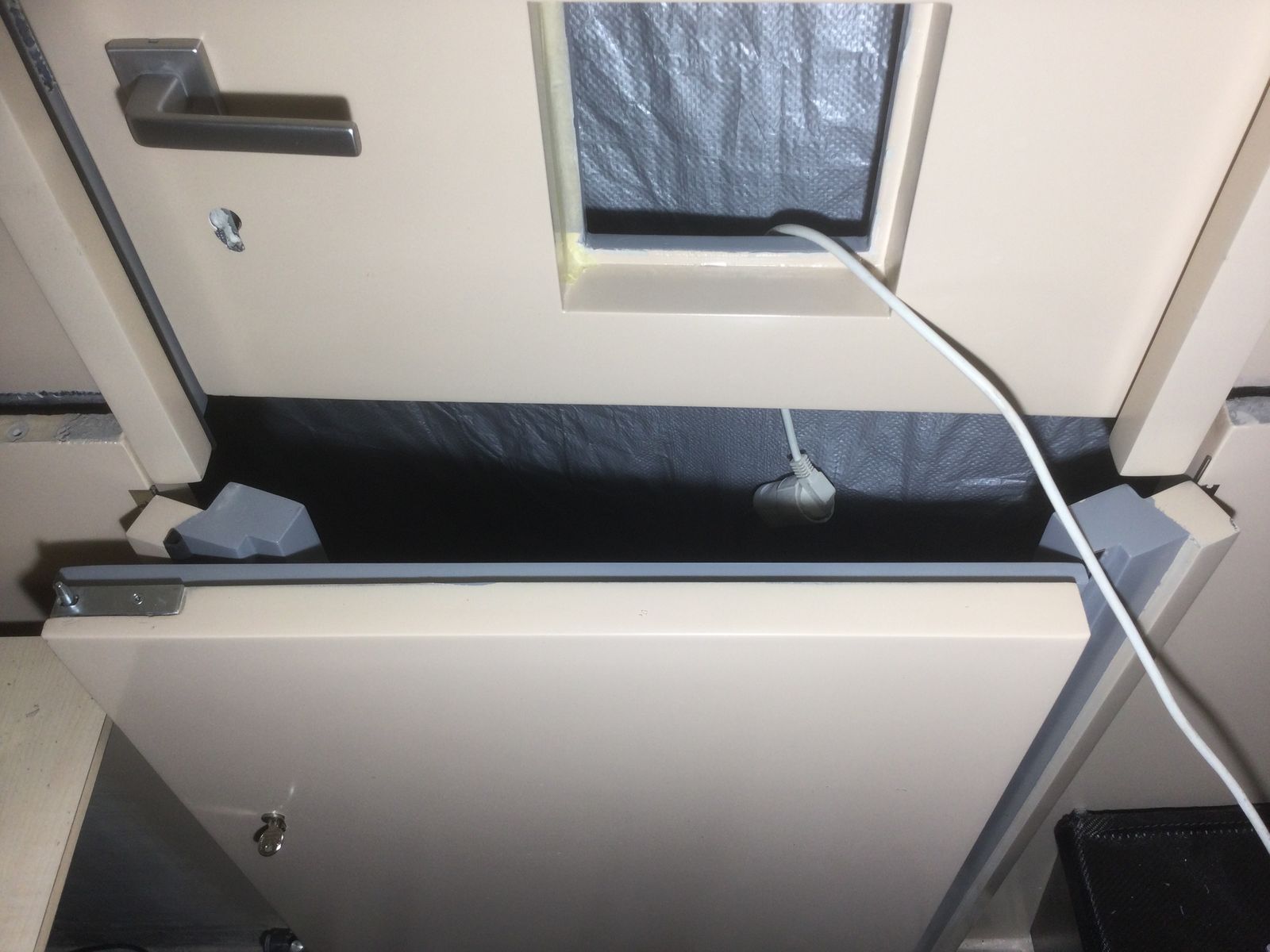 Die Tür Richtung Fahrerhaus zum durchschlüpfen liegt später unterhalb des Tisches. Sie wiegt komplett 4,4 kg. Aussen ist sie weitgehend bündig, da hier der Deckel dran vorbeifährt.