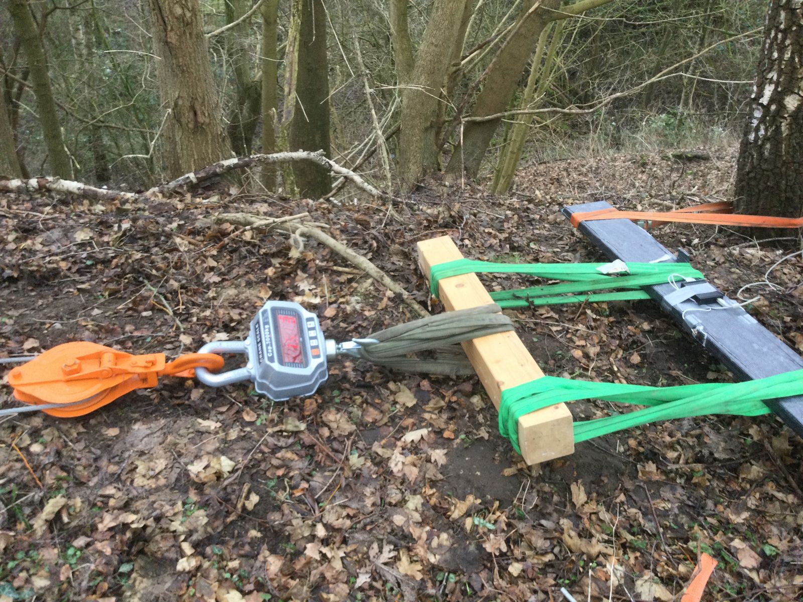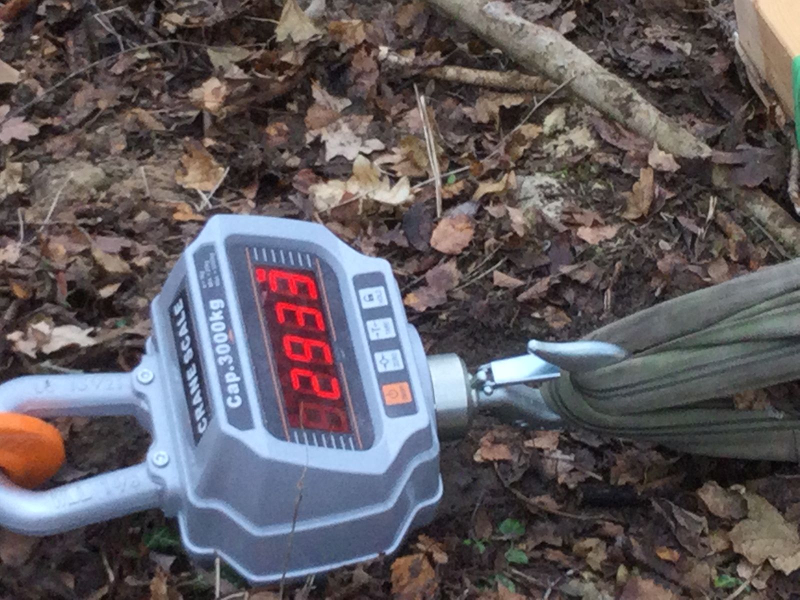 Dann im Wald stabile Bäume gesucht und einen 4-Punkt Biegeversuch aufgebaut. Die grünen Rundschlingen greifen unter die Auflagepunkte für den Fahrzeugrahmen. Hier habe ich eine Gesamtdicke von 1cm in dem Träger. Mit einem 1,5 to Greifzug und einer Umlenkrolle, mit der Kranwaage dazwischen, habe ich mutig bis auf 3.000 kg gezogen. Es ist weder ein Baum umgefallen, noch hat ein Gurt versagt. Der CFK-Träger hat sich übrigens ganz ruhig verhalten, obwohl die Zuschauer dagegen gewettet haben.