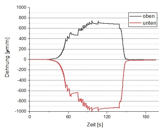 Das Signal der Dehnungsmessstreifen habe ich aufgenommen. Es zeigt sich, dass die Stauchung wie erwartet grösser ist als die Dehnung auf der Zugseite der Fasern.