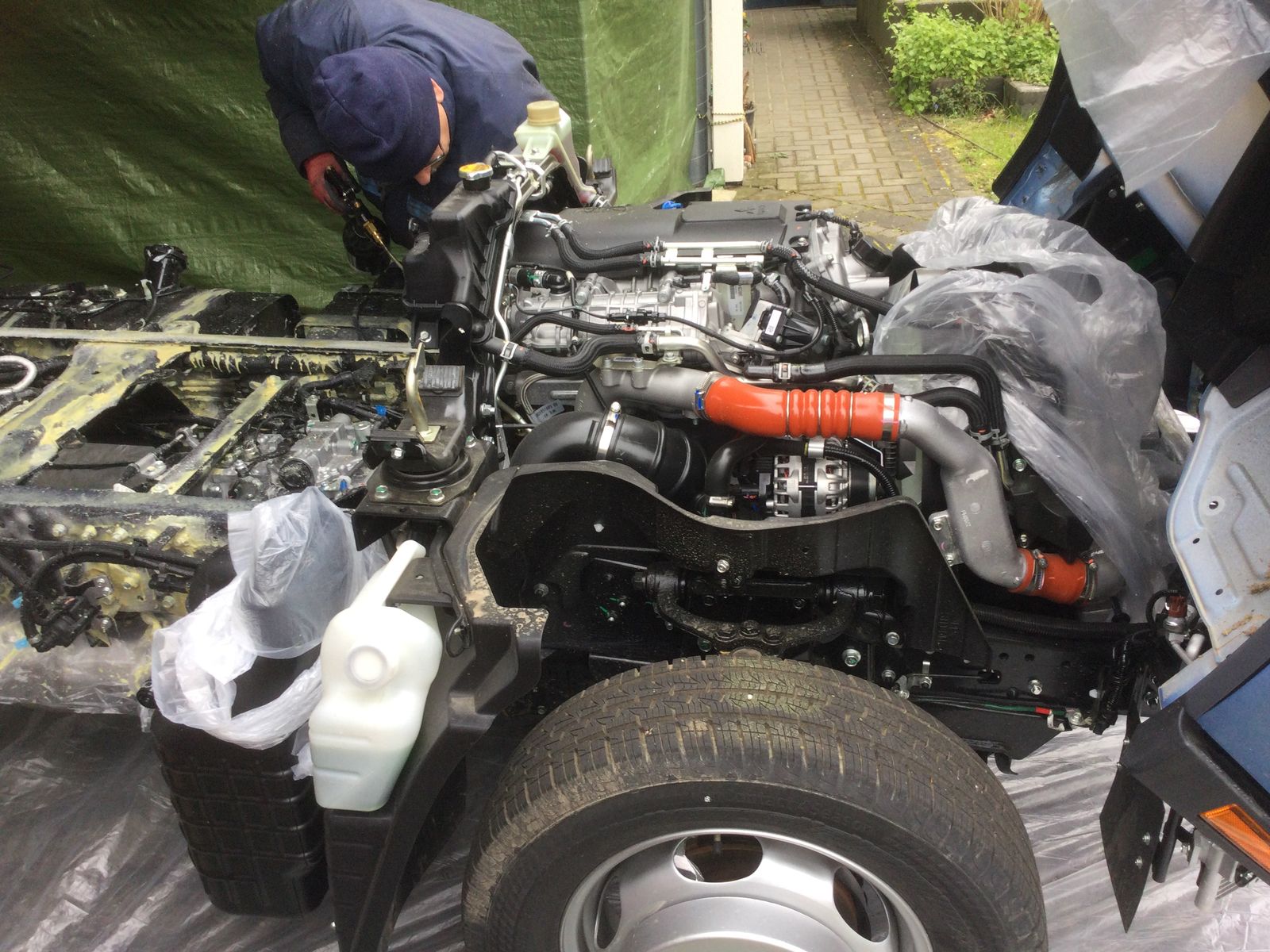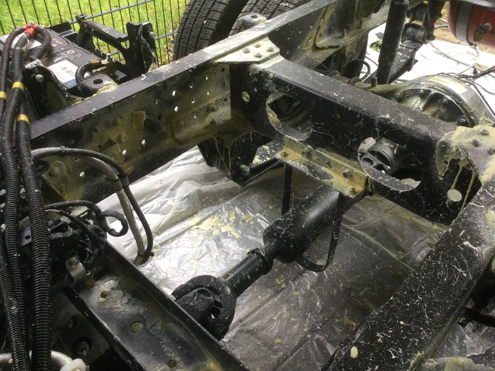 WoMoG wollte sich für die Profilherstellung revanchieren und ist mit seinem Equipment zum Konservierungsfett spritzen angereist. Eigentlich wollte ich den Fuso in die Halle fahren, aber er liess sich nicht starten. Der Anlasser drehte, aber es kam kein schwarzer Rauch. Also wurde im kalten, zugigen Carport gefettet. Insgesamt haben wir 4kg Timemax 2000 auf >100 °C erwärmt und an den Fahrzeugrahmen, insbesondere in die vielen Spalte gespritzt. Die Unterlegfolie, das Gartenhaus vom Nachbarn, mein Wohnaufbau und einige Pflanzen haben auch ihr Fett abbekommen.