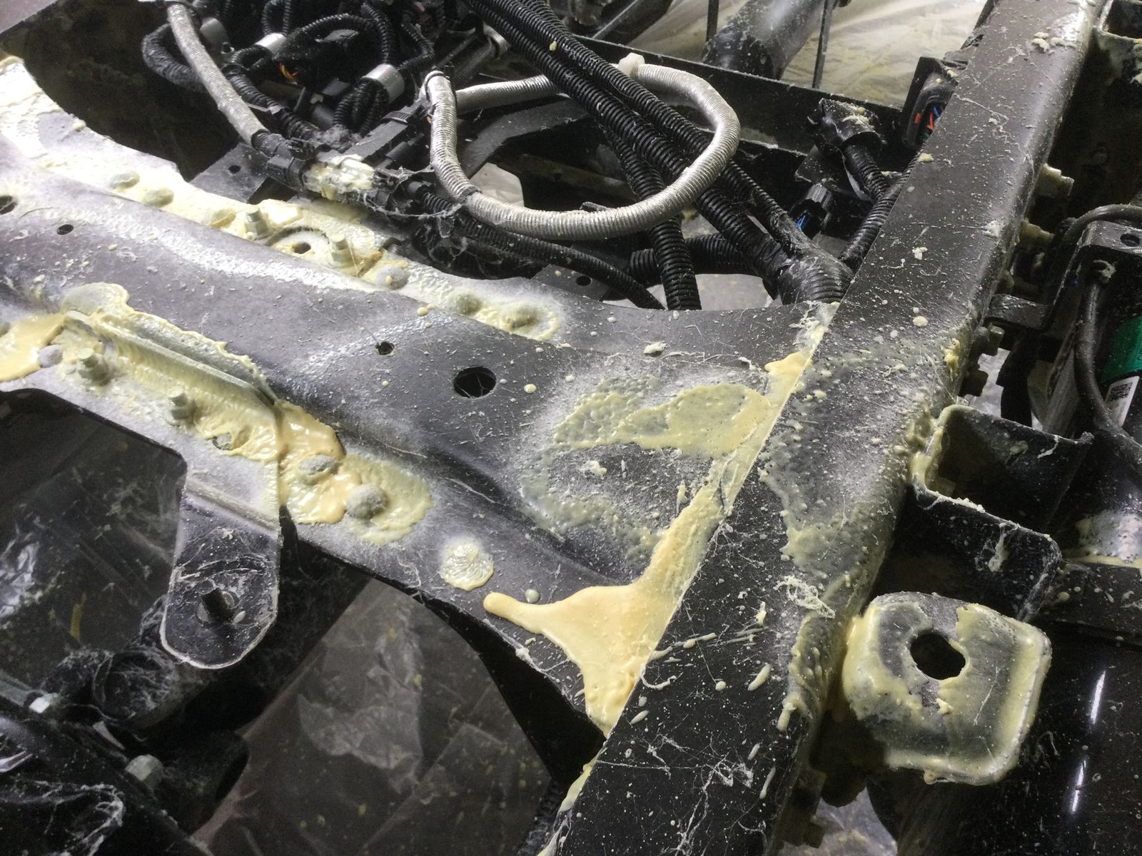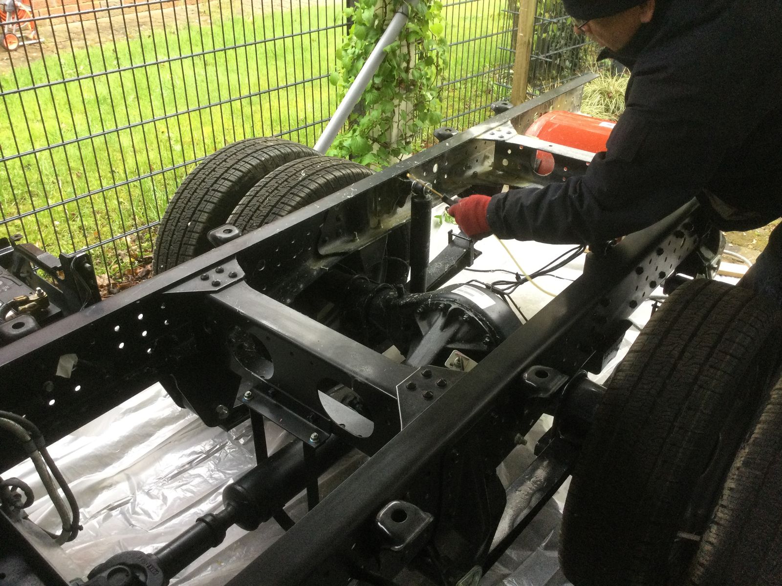 WoMoG wollte sich für die Profilherstellung revanchieren und ist mit seinem Equipment zum Konservierungsfett spritzen angereist. Eigentlich wollte ich den Fuso in die Halle fahren, aber er liess sich nicht starten. Der Anlasser drehte, aber es kam kein schwarzer Rauch. Also wurde im kalten, zugigen Carport gefettet. Insgesamt haben wir 4kg Timemax 2000 auf >100 °C erwärmt und an den Fahrzeugrahmen, insbesondere in die vielen Spalte gespritzt. Die Unterlegfolie, das Gartenhaus vom Nachbarn, mein Wohnaufbau und einige Pflanzen haben auch ihr Fett abbekommen.