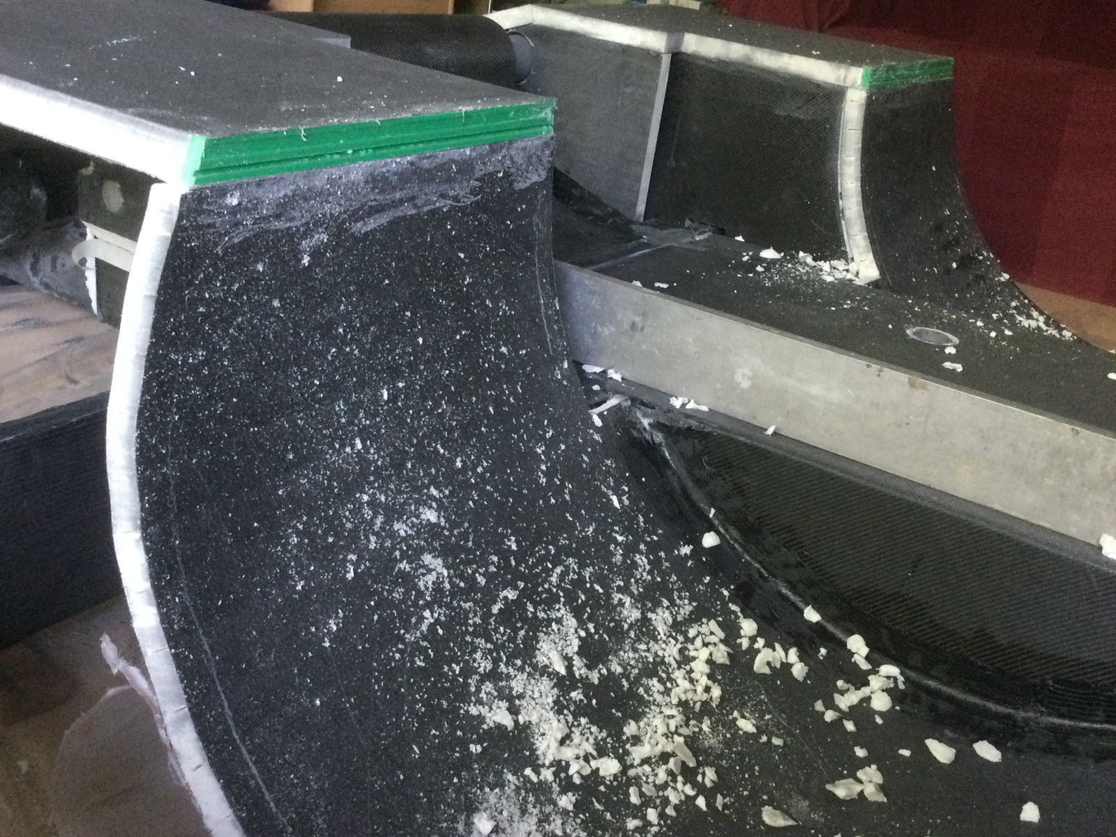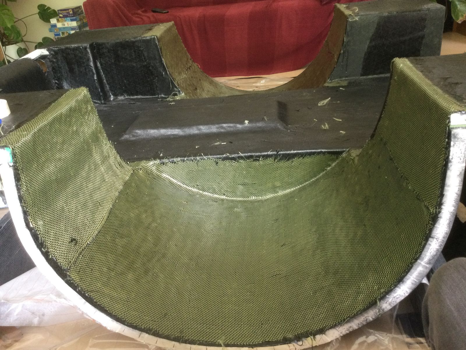 Am Sonntag war alles vorbereitet und ich habe 9 Stunden gebraucht, um 36 m2 Kohlegelege mit 13 kg Harz zu verarbeiten. Aufgrund der tiefen Arbeitshaltung gab es schönen Muskelkater und meine Arbeitsbekleidung ist jetzt steif und passt nicht mehr in die Waschmaschine, weil ich mich über fertig laminierte Stauboxen beugen musste.