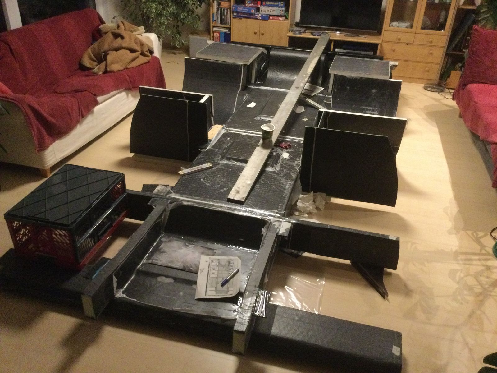 Black is beautyful, hat meine Tochter gemalt, als ich im Wohnzimmer einziehen durfte. Die im Keller seit Januar gefertigten Querträger und Tanks kamen nach und nach ins Wohnzimmer, wurden ausgerichtet und untereinander verklebt.