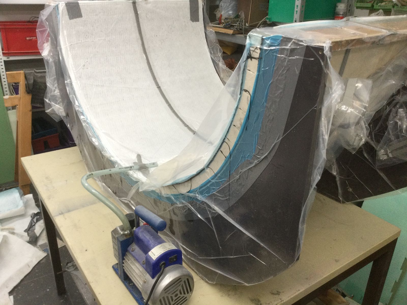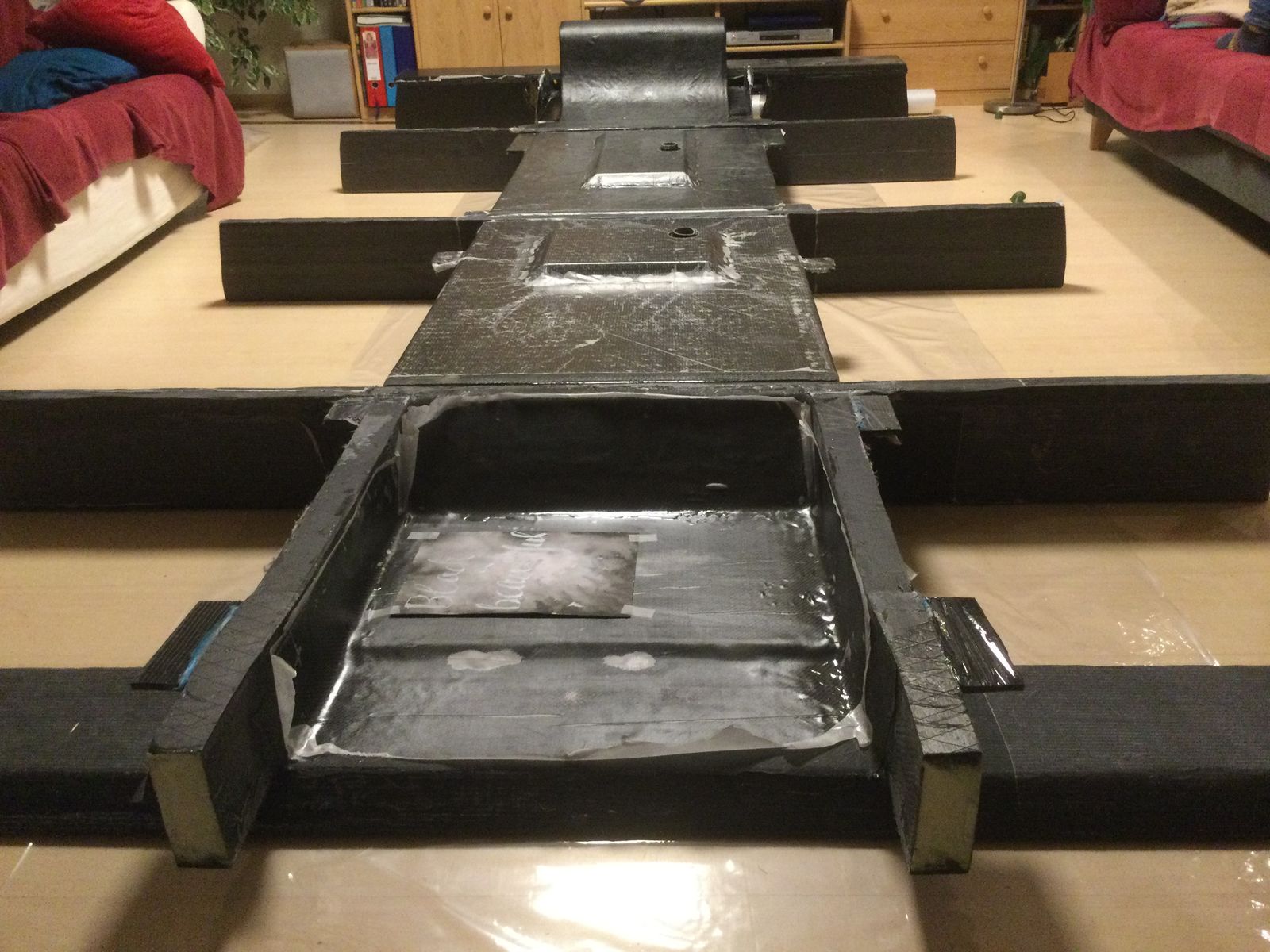 Am Sonntag war alles vorbereitet und ich habe 9 Stunden gebraucht, um 36 m2 Kohlegelege mit 13 kg Harz zu verarbeiten. Aufgrund der tiefen Arbeitshaltung gab es schönen Muskelkater und meine Arbeitsbekleidung ist jetzt steif und passt nicht mehr in die Waschmaschine, weil ich mich über fertig laminierte Stauboxen beugen musste.