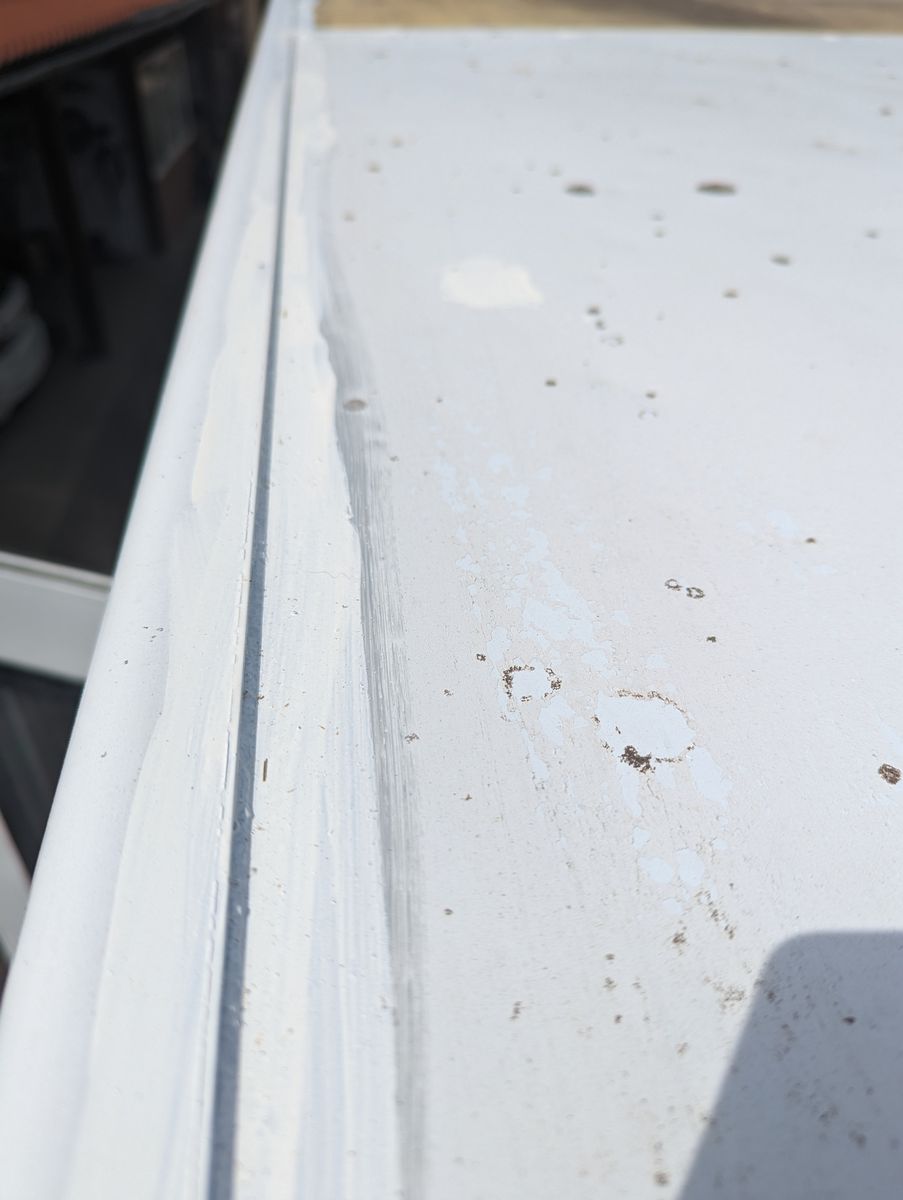 Moin,diese Abdichtung auf dem Dach sieht mir etwas purös aus . Würde ich abdchneiden ,abschleifen und neu mit einem Polymer abdichten .Dieses lässt sich nach dem auftragen leicht mit Handseife auf dem Finger glatt ziehen .