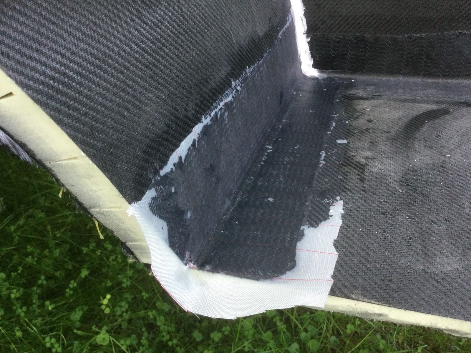 Ich habe die Tankinnenseiten mit Kohlefaser laminiert und festgestellt, dass der ganze Rahmen von vorne bis hinten bis in die Tanks aufgrund der Kohlefaser leitfähig ist. Die Tankinnenwände haben ein 55 gr/m2 Glasfasergewebe sowie eine trinkwassergeiegnete Harzschicht mit grauer Farbpaste bekommen.