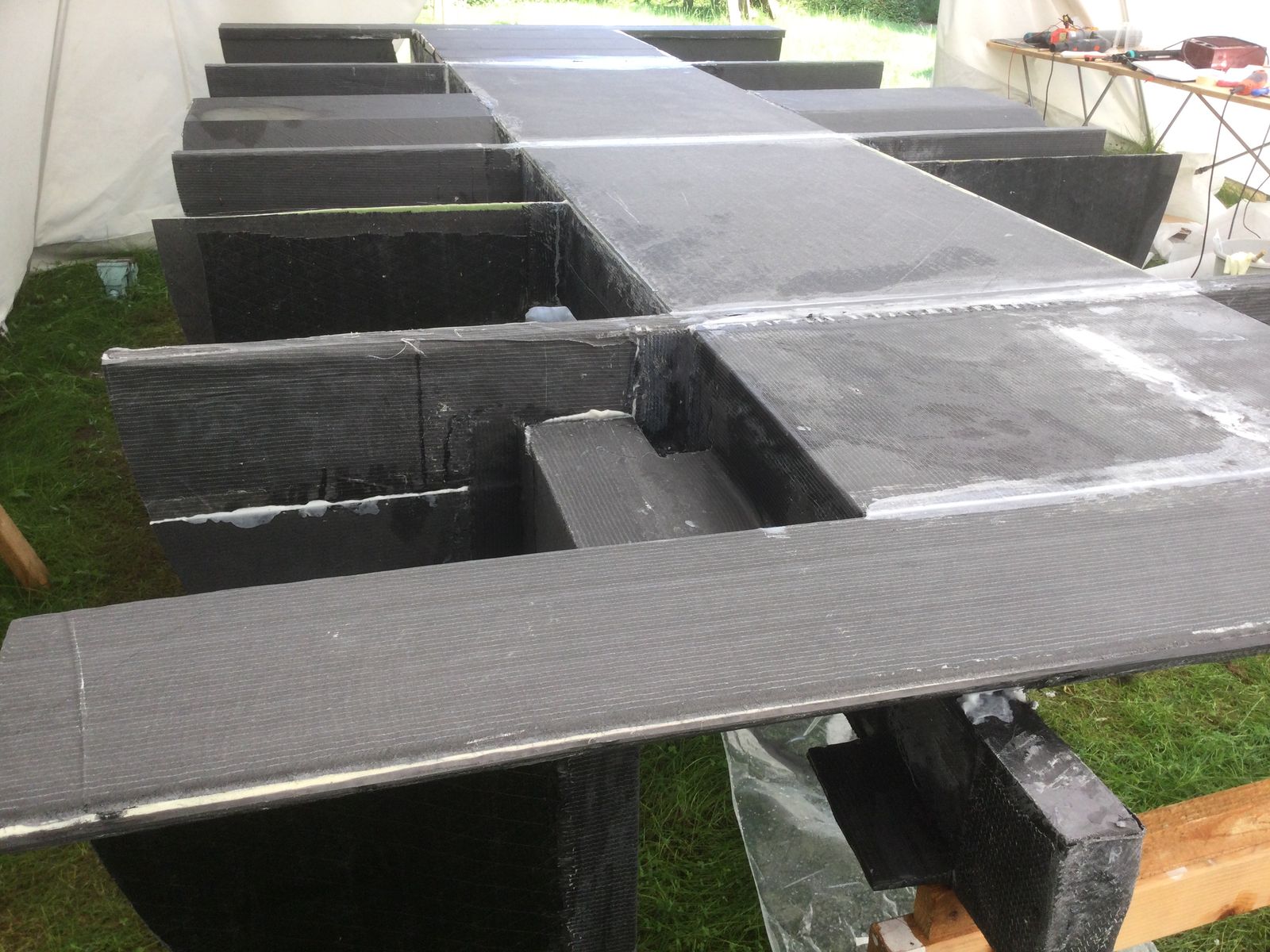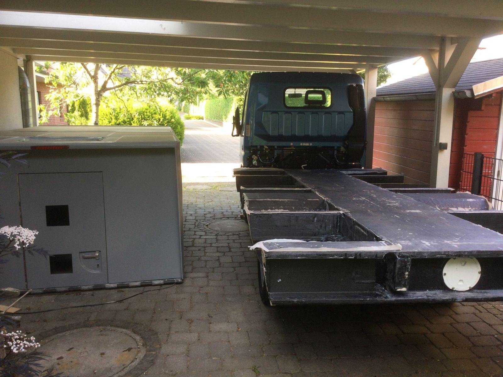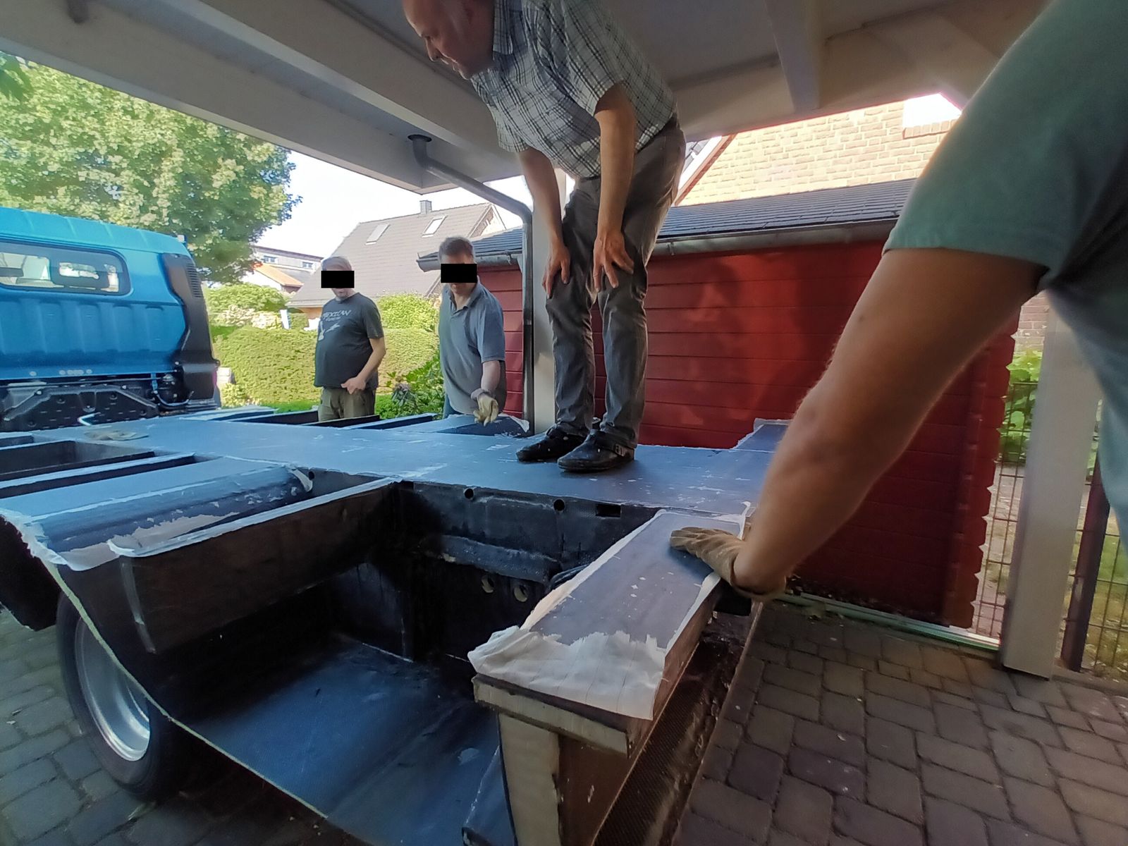Der Wohnaufbau ist zusammengefahren und sollte eigentlich in zwei Tagen zumindest einmal trocken auf den Rahmen gesetzt werden, mal sehen, ob es dazu kommt.