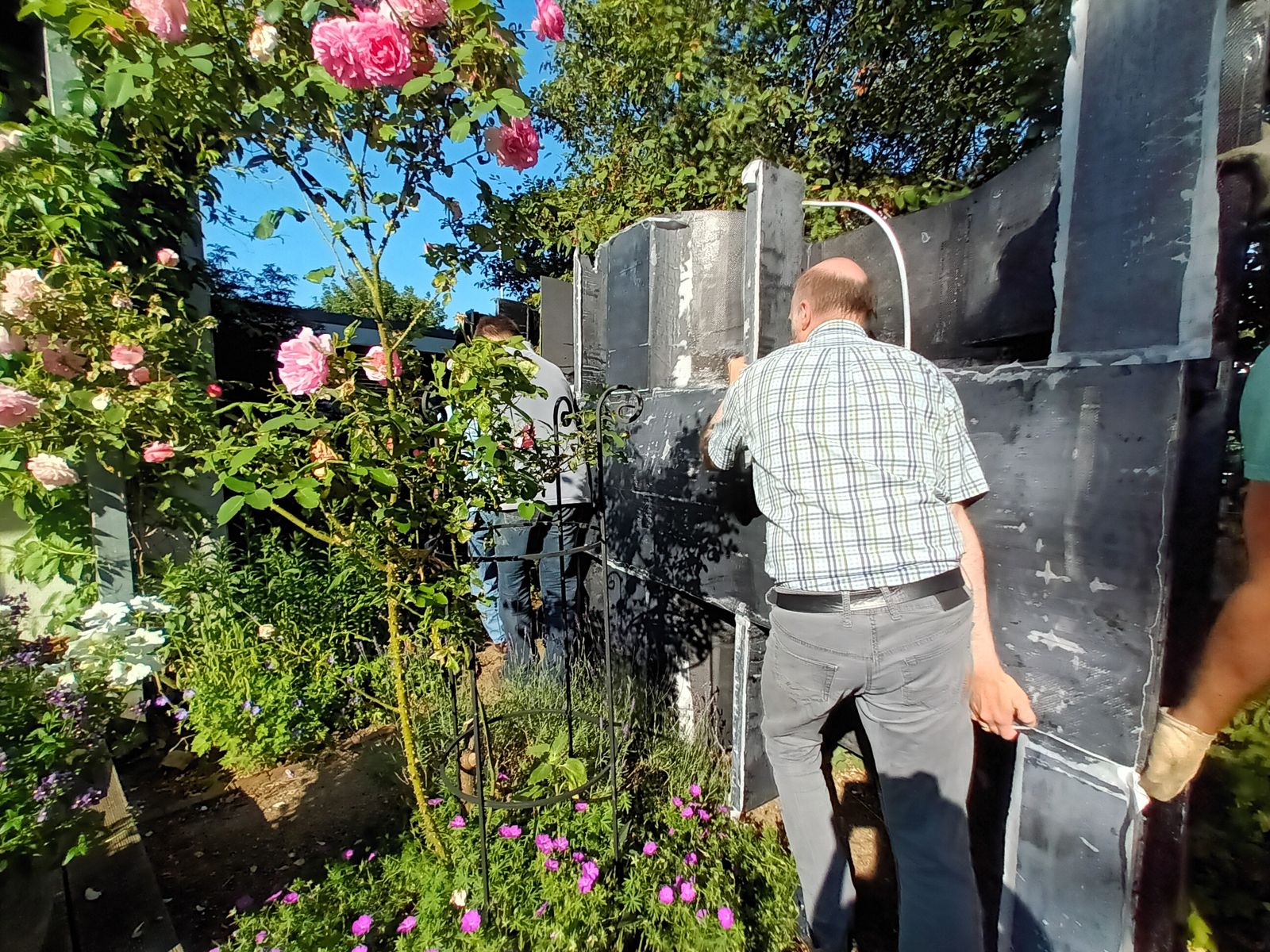 Dann mit den Nachbarn 30 Meter vom Zelt durch die Botanik und leichten Kollateralschäden (an den Pflanzen) ins Carport.
