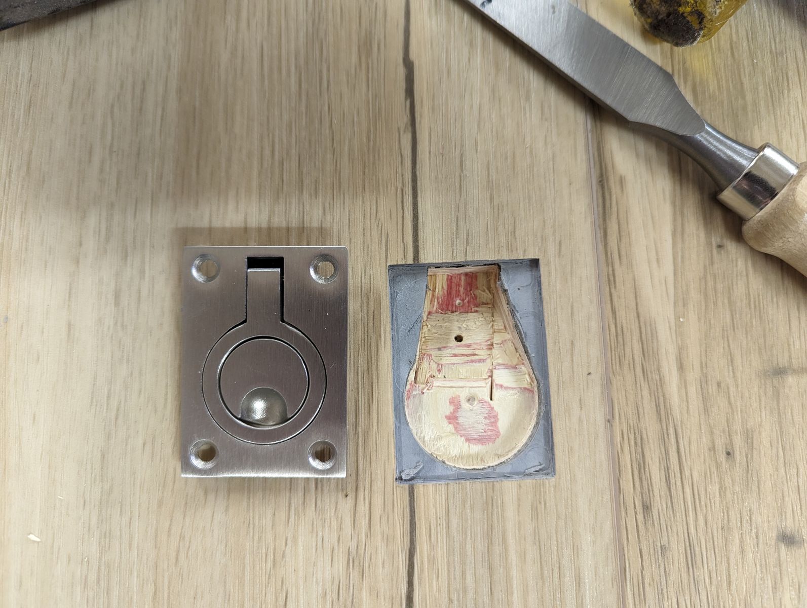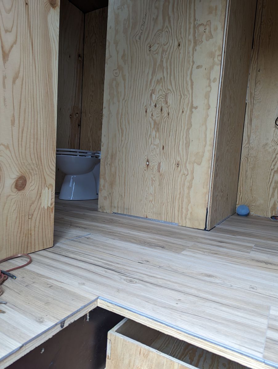 Seit einigen Wochen ist der Fußboden drin, komplett PVC Nut-Feder Paneele, mit Fußbodenkleber verklebt. Für die Klappen habe ich diese Griffe bei Amazon gefunden. Schick und einfach zu montieren.