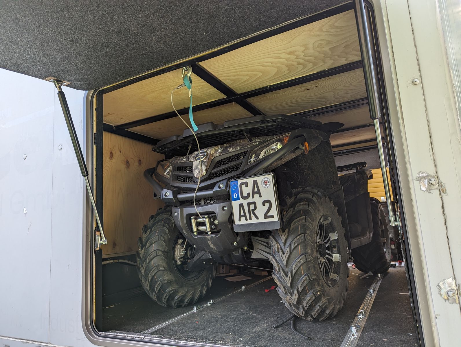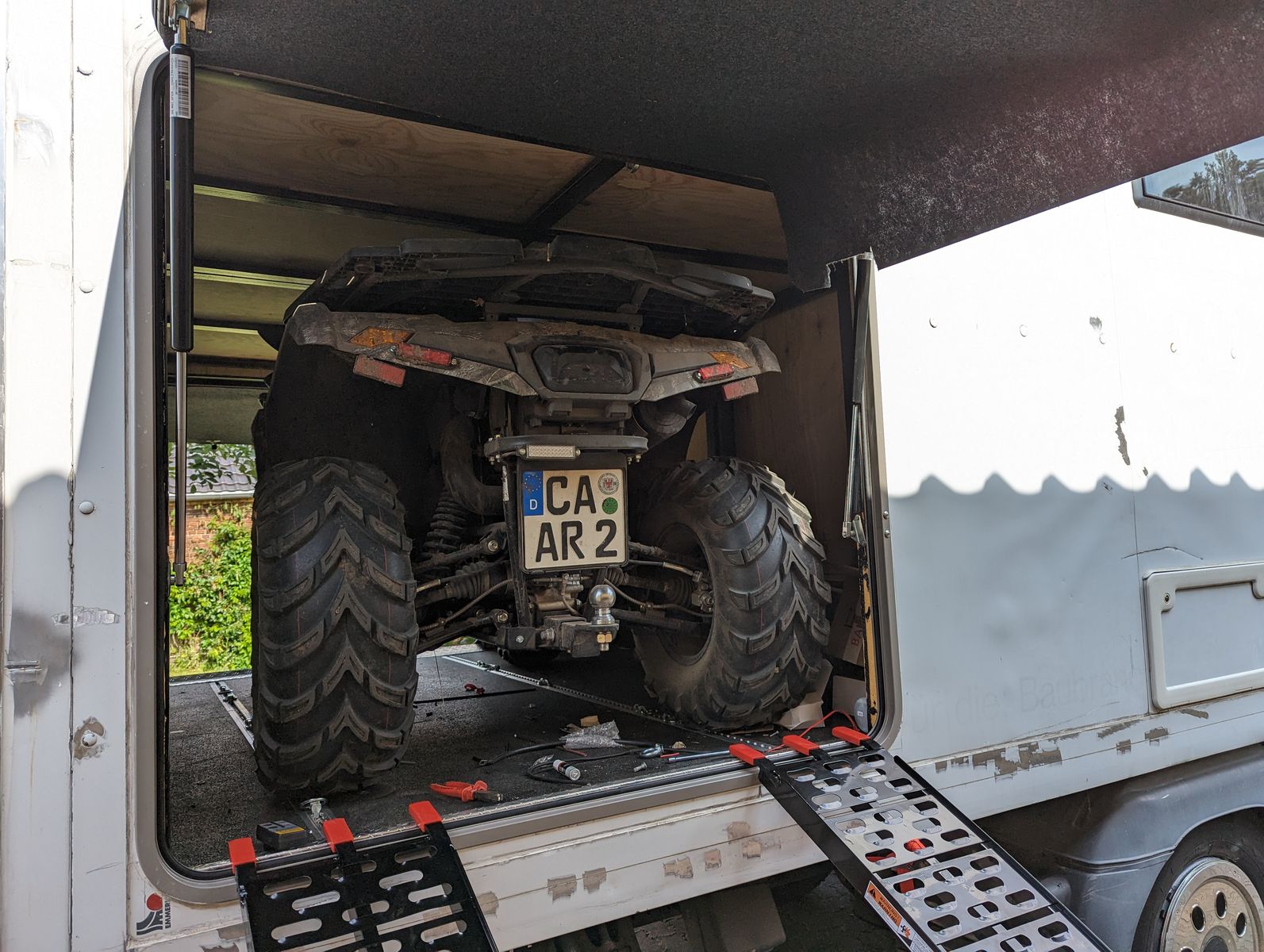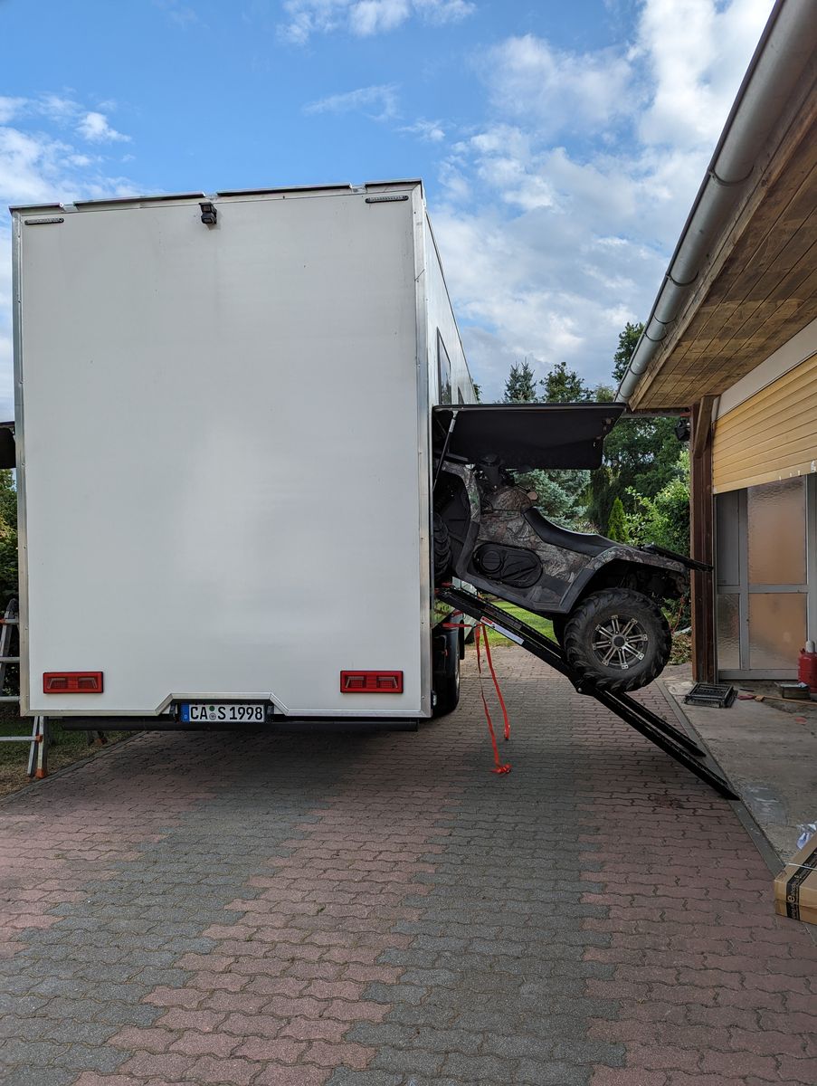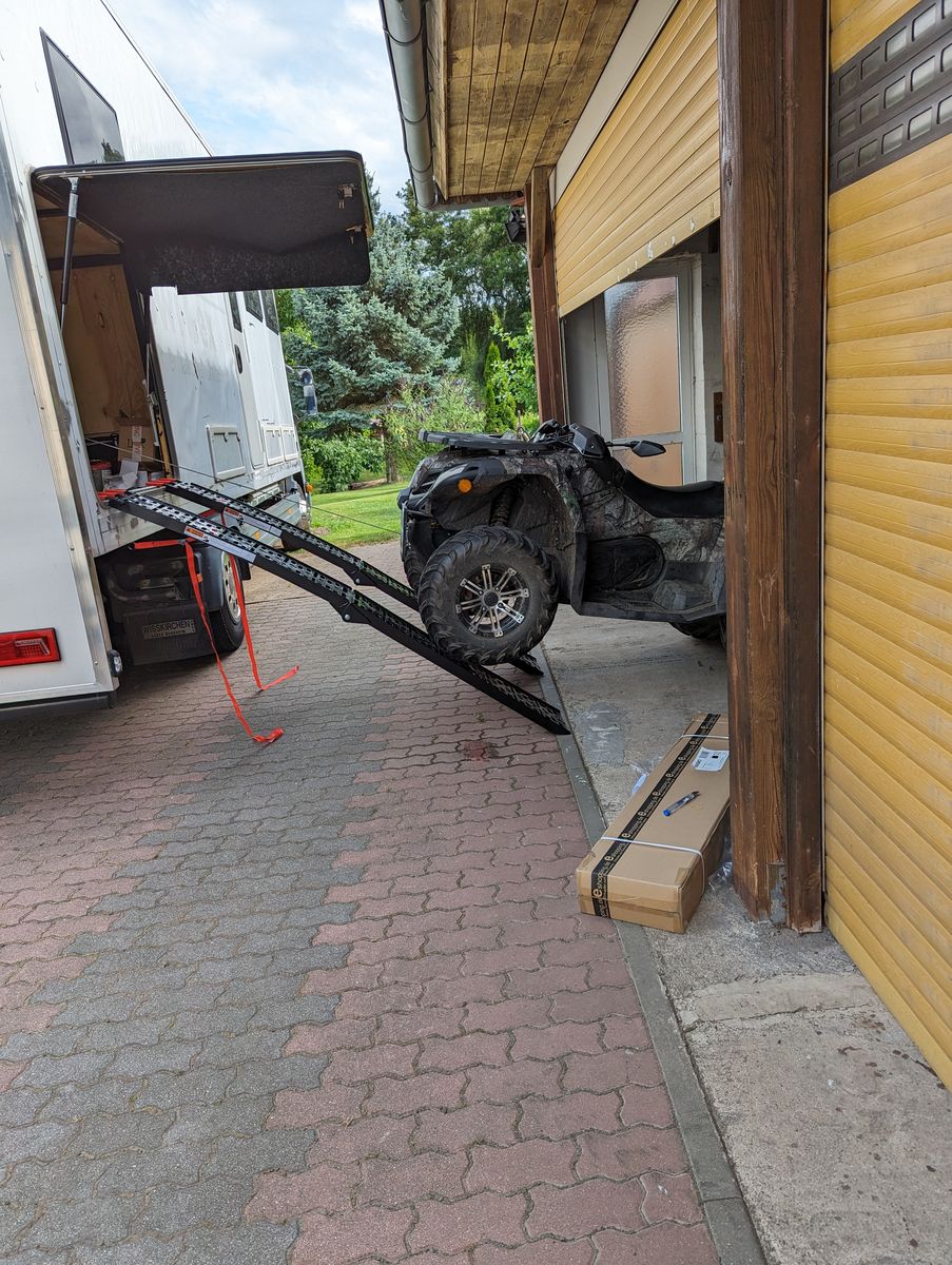 Zum Geburtstag hat die beste aller Frauen mir die Auffahrrampen geschenkt. An meinem CXF 450 ATV habe ich nun eine Fernbedienung für die serienmäßige Winde nachgerüstet und gleich mal probiert, ob ich richtig gemessen hatte. Hatte ich. Das Quad hat genug Bodenfreiheit die Rampen sind stabil genug, die Winde ist stark genug und es ist genug Platz in der Garage. Ich muß lediglich den Lenker flach legen und natürlich eventuelle Koffer abbauen. Dann das Seil an die Augen am Garagendach anschlagen und los geht es. Das funktioniert von links und von rechts.