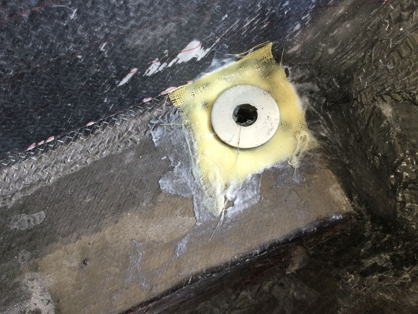 Bei der Gelegenheit habe ich die Schraubverbindungen mit dem Fahrzeugrahmen noch isoliert. Es soll nur eine Verbindung von Kohlefaser und Metall in einem trockenen Bereich geben, um Korrosion zu vermeiden.