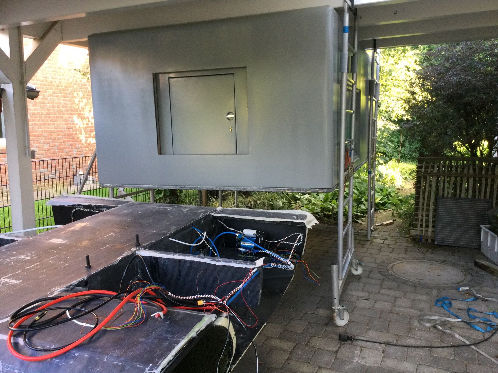 Den Aufbau habe ich nochmal abgenommen, weil die Verklebung mit dem Rahmen noch fehlt. Da die Nachbarn alle im Urlaub waren, habe ich mein Gerüst bemüht und den Aufabu alleine mit Spanngurten hochgehoben.